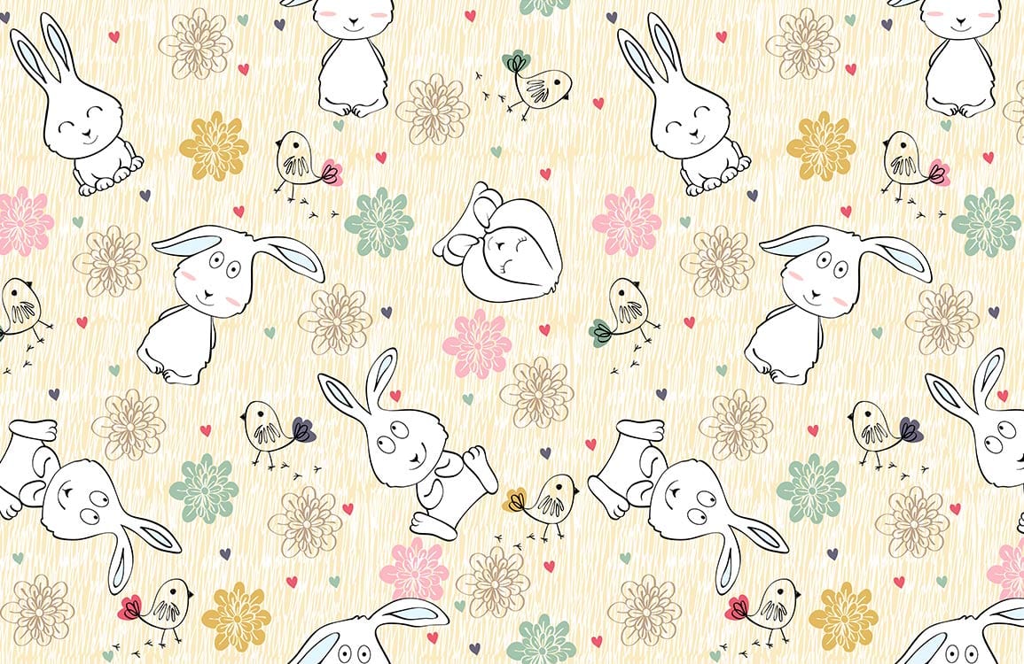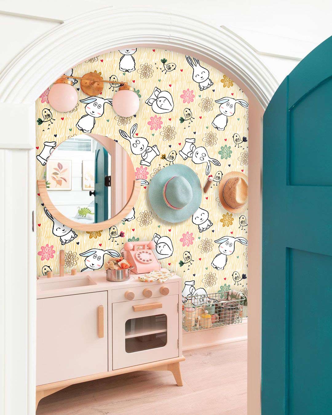 Delight in the whimsy and charm of the Cute Bunny Wallpaper Mural, where delicate sketches of playful rabbits and cheerful florals dance against a soft, textured backdrop. The intricate detailing in this design brings a gentle playfulness that complements both modern and traditional interiors, while the warm, pastel hues provide a cosy and inviting atmosphere.