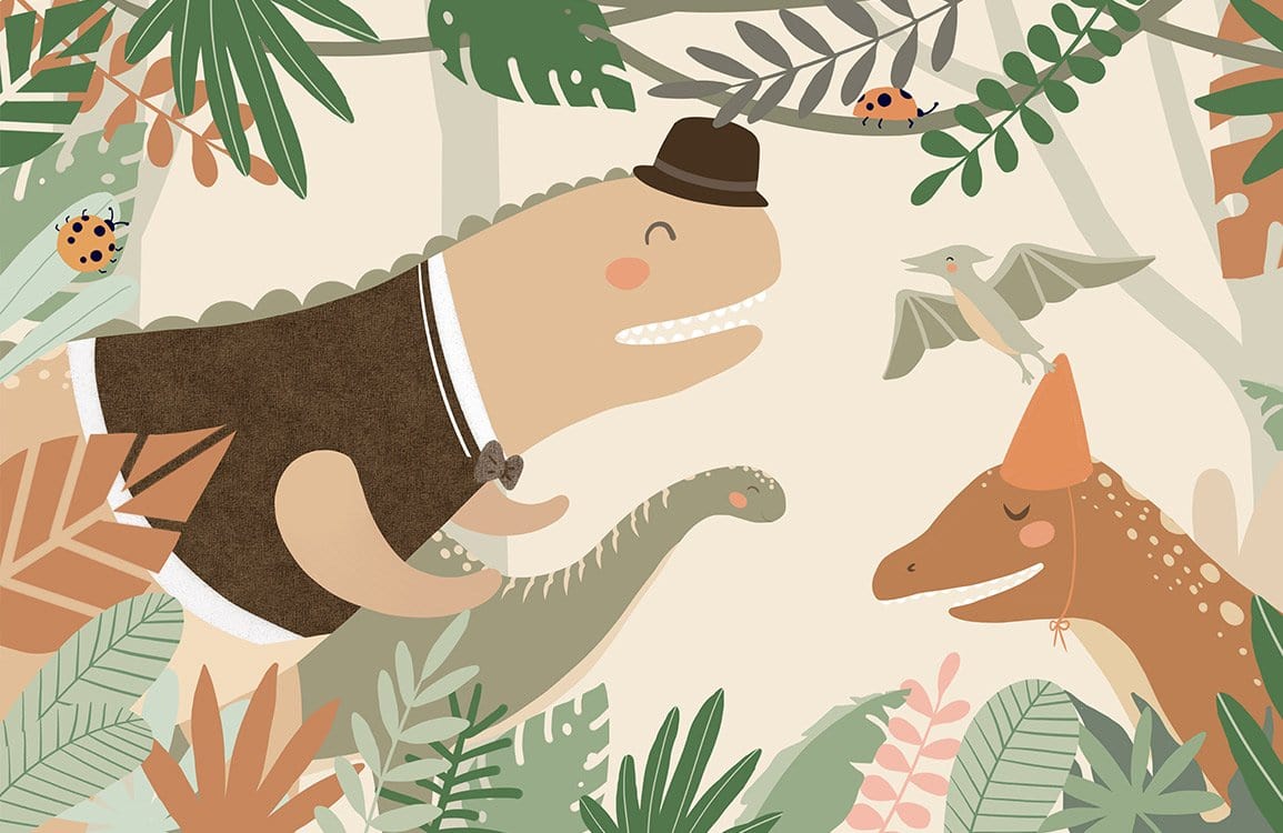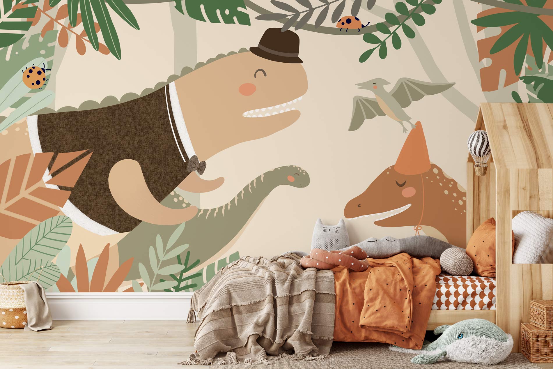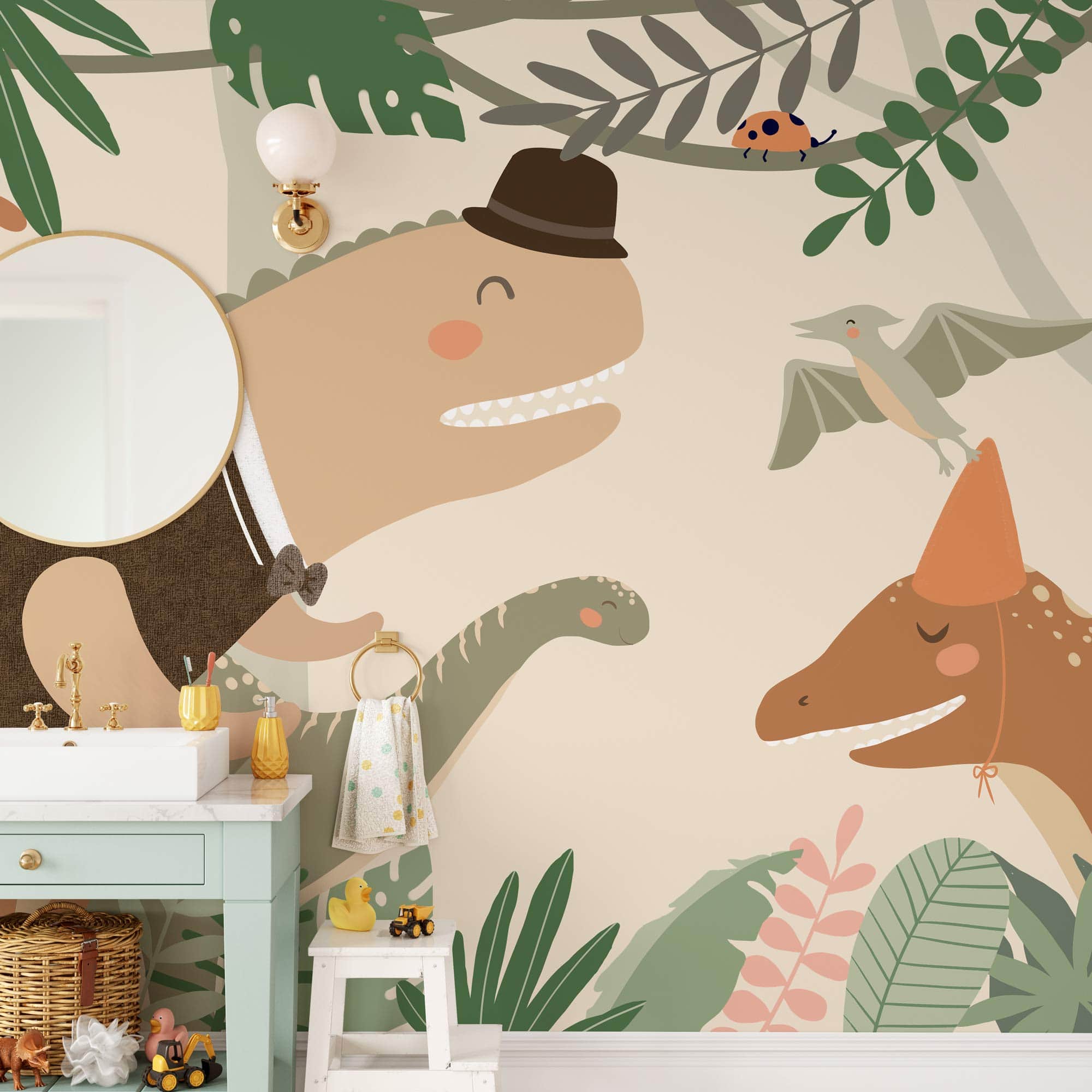This Dinosaurs Wallpaper Mural captures the playful elegance of prehistoric charm, blending whimsical dinosaur illustrations with lush green foliage. The subtle interplay of earthy tones against a creamy background adds depth and warmth, making it a captivating feature in any space. Its sophisticated yet whimsical design invites a sense of wonder, seamlessly integrating into both contemporary and vintage-inspired interiors.