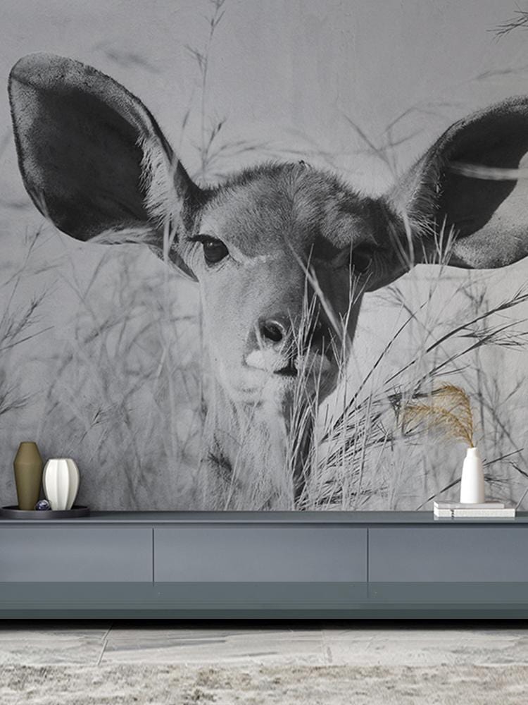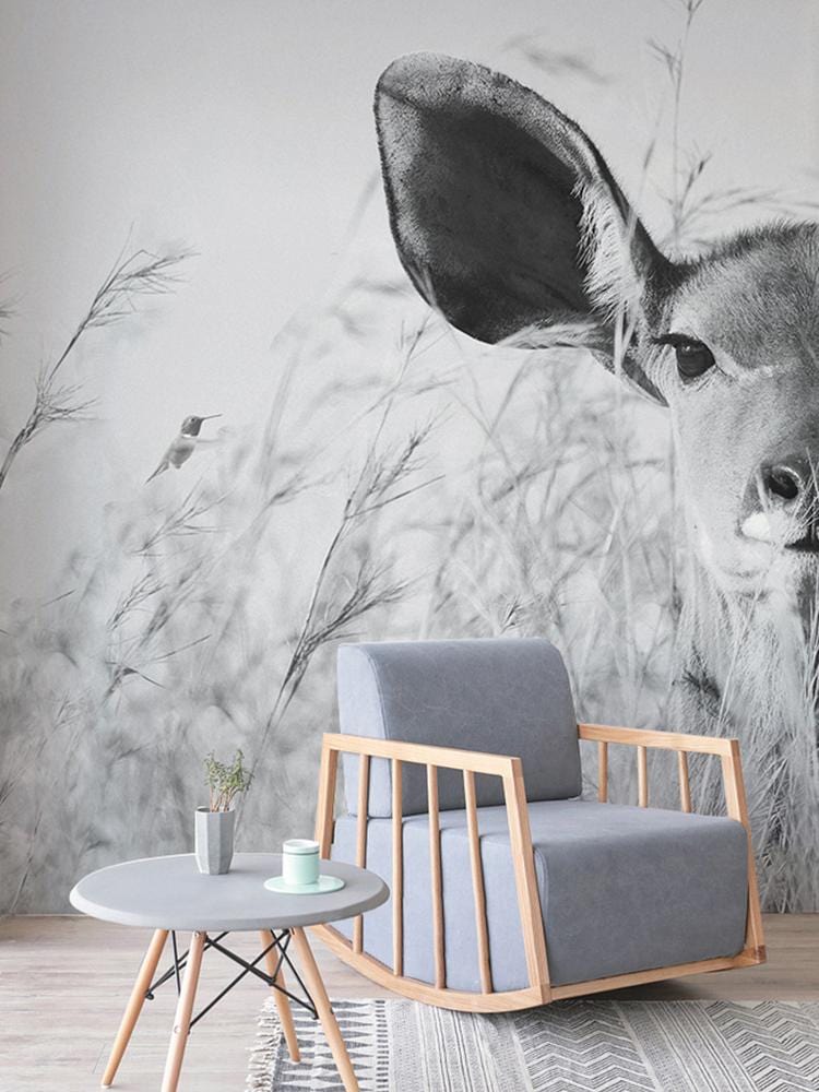 Stay cool with this cute deer wallpaper mural. The close up of the deer portrait in the field gives a photorealistic effect to the picture. This discerning piece of design brings an impeccably subtle allure as a feature wall in your living space or dining area. Clean white flooring adds sass to this look as it opens up space to an unique feel.