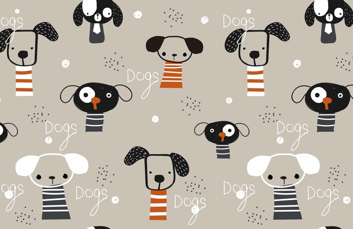 Adorn your walls with a whimsical yet sophisticated Cute Dog Pattern Wallpaper Mural. Featuring charming dog illustrations against a soft grey backdrop, this mural brings a playful elegance to any room. The monochrome palette, accented with subtle touches of orange, balances fun and style, making it suitable for diverse interior designs. Perfect for adding a touch of unique, artistic flair that complements both modern and vintage aesthetics.