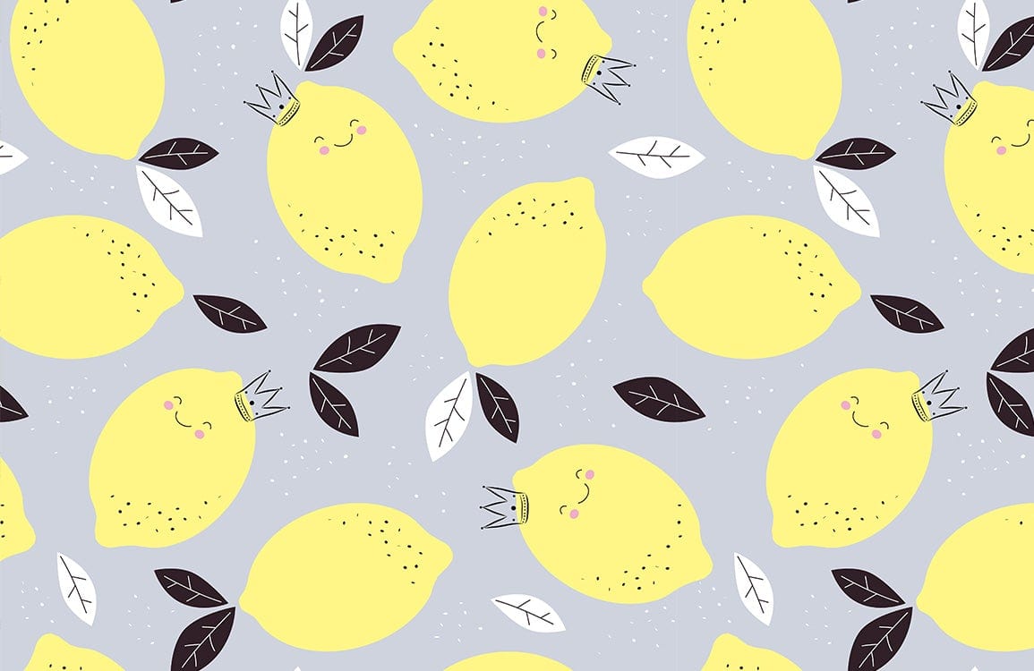 Infuse your space with a touch of whimsy and charm through this delightful lemon wallpaper mural. Each bright and playful lemon, adorned with cheerful crowns and surrounded by contrasting leaves, dances across a soft grey backdrop. The artistic design captures a playful yet refined aesthetic, making it a versatile piece that can effortlessly enliven any room while maintaining a sophisticated and timeless appeal.