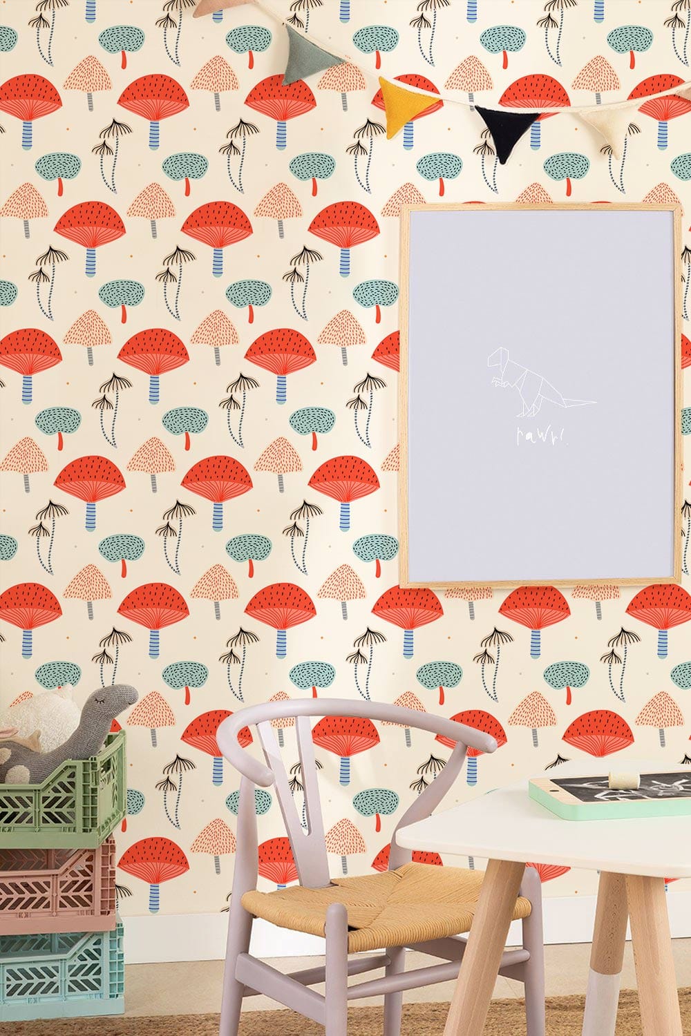 A mystical fungal grove with beautiful Cute Red Mushrooms Wallpaper Mural. The adorable red mushrooms motif effortlessly integrates into any room's style and adds a striking texture to your area, making it a lovely backdrop for your child's room and a great decorative piece for the home. This mushroom wall decor's complementary tone is ideal for creating a relaxing and calming atmosphere in your office, family room, or even bathroom.