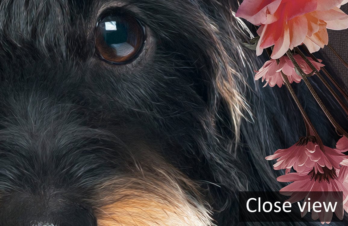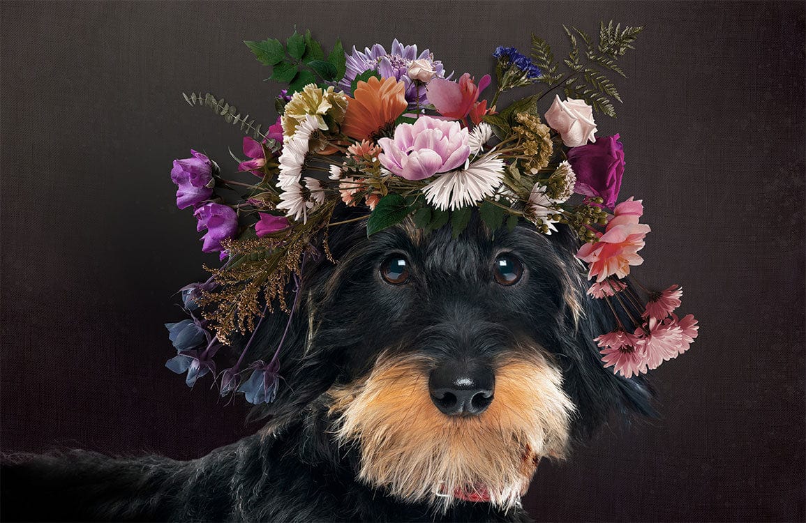 This Schnauzer with Flowers Wallpaper Mural exudes charm and whimsy, showcasing a delightful canine adorned with a vibrant floral crown. The intricate detailing of the blossoms melds seamlessly with the delicate textures of the dog's fur, creating a captivating focal point. Its nuanced palette imbues any space with an air of refined elegance, making it a perfect fit for those seeking a touch of unique artistry in their interiors.