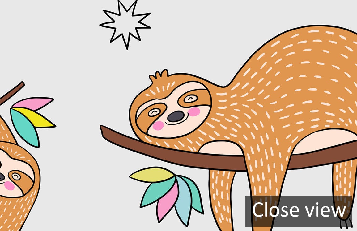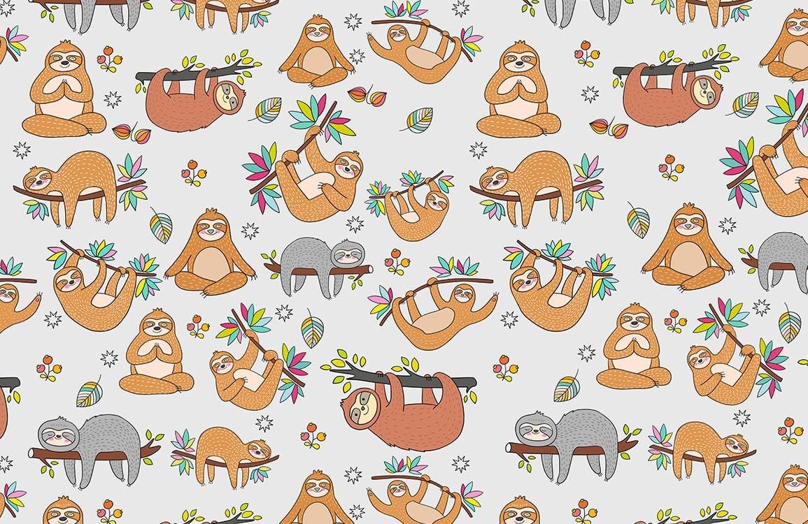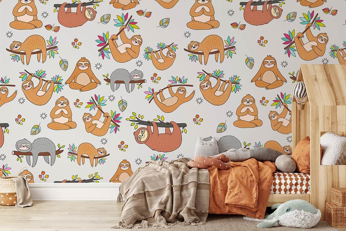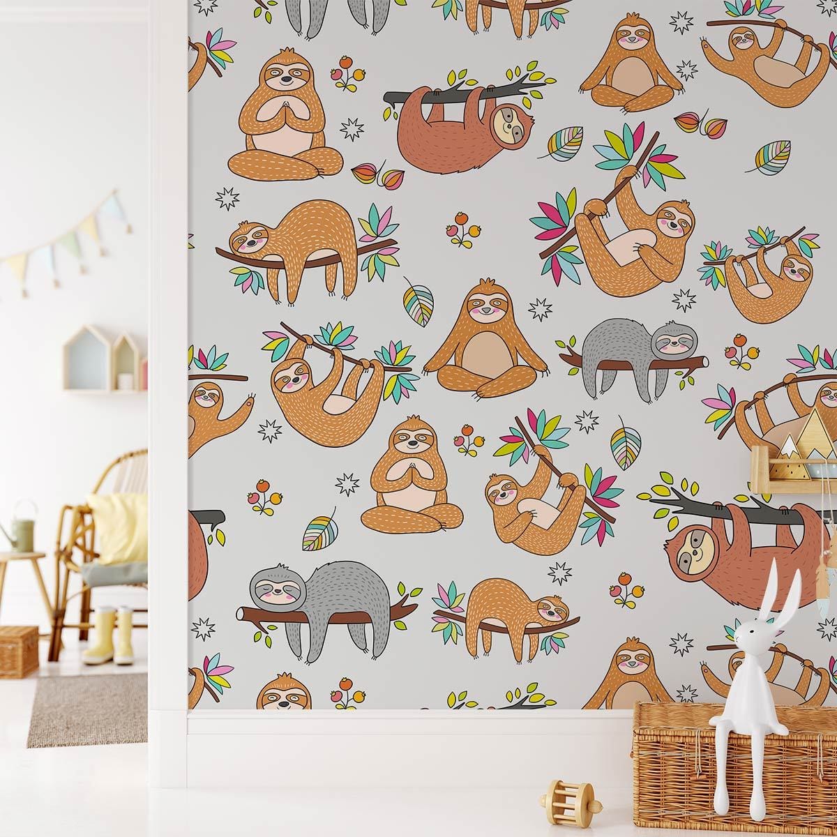This charming Cute Sloth Wallpaper Mural offers a delightful display of whimsical sloths, elegantly intertwined with playful foliage patterns. It presents an artistic balance of endearing imagery that captures the leisurely spirit of these gentle creatures. The mural's intricate illustrations provide a sophisticated touch, making it an exquisite choice for creating a calming and light-hearted atmosphere across various interiors.