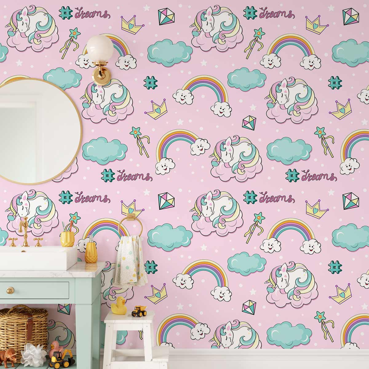 This charming unicorn wallpaper mural captivates with its whimsical design, featuring playful unicorns amidst a dreamy pink backdrop adorned with pastel clouds, rainbows, and celestial crowns. The delicate details and soft textures imbue a serene and enchanting vibe, making it a sophisticated choice for both contemporary and eclectic interiors.