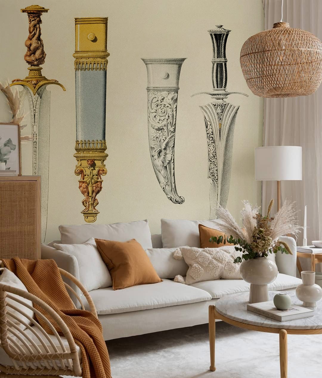 Immerse your space in an ambience of refined elegance with the Daggers and Sheaths Wallpaper Mural. Featuring a sophisticated design of intricately detailed daggers and richly adorned sheaths, this mural embodies artistic craftsmanship and historical allure. The intricate detail of each piece adds depth and complexity, making it a striking focal point that complements both traditional and contemporary interiors.