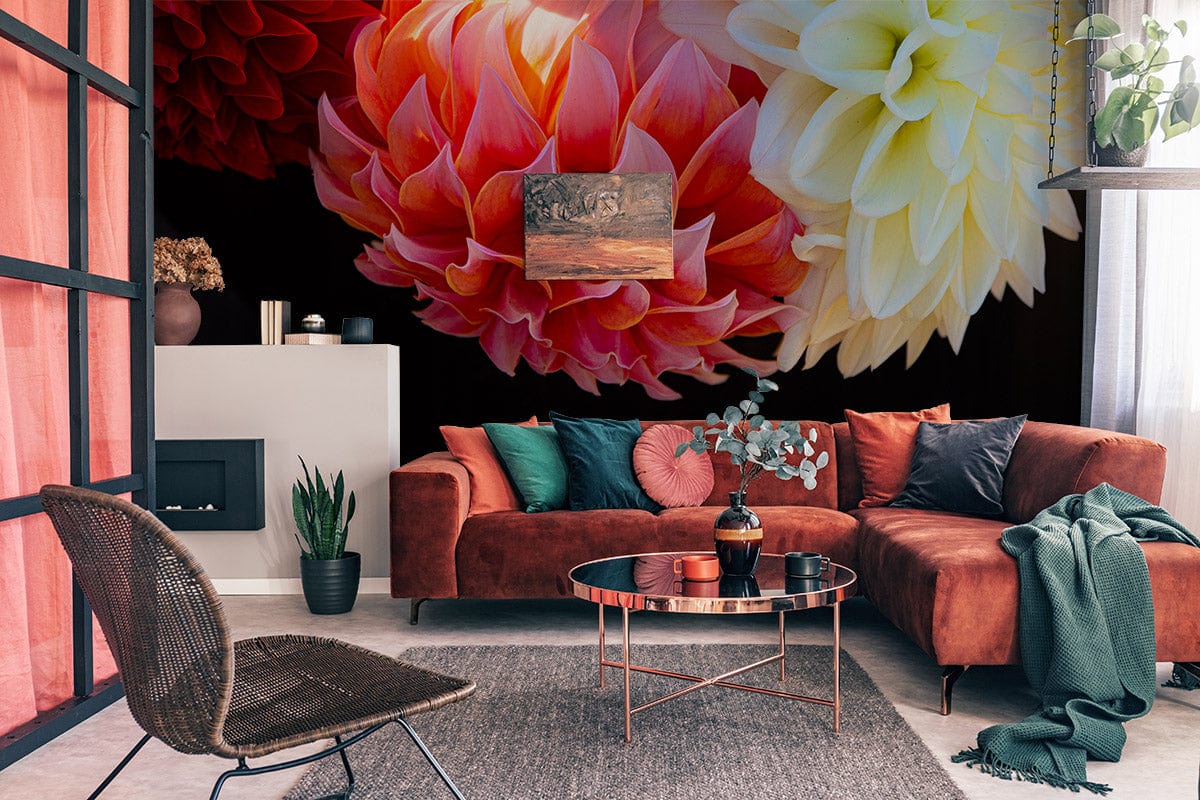 Immerse your space in the timeless elegance of the Dahlias Soak Wallpaper Mural, where nature meets artistry. This exquisite design showcases luxuriant dahlia blossoms in vibrant shades set against a dark, dramatic backdrop, creating a striking visual contrast. Perfectly suited for both classical and contemporary interiors, its captivating detail brings sophistication to living spaces, making every room feel like a serene retreat.