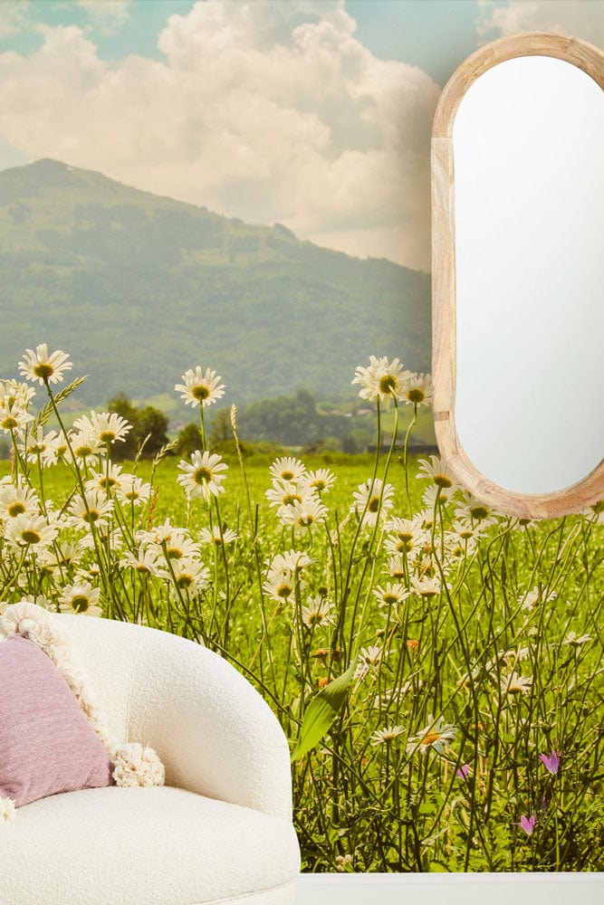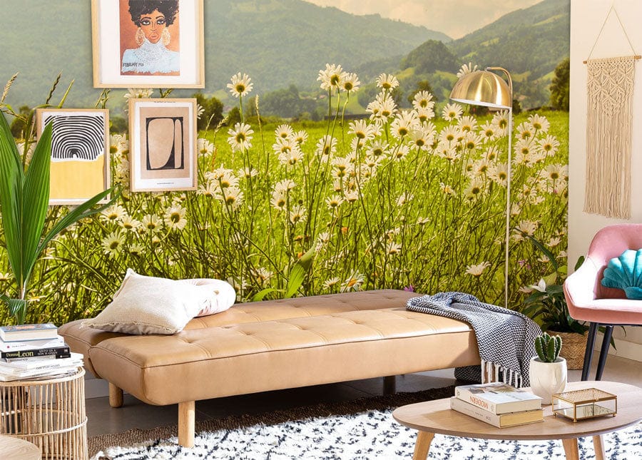 The Daisy World Wallpaper Mural gracefully captures the serene charm of a sunlit meadow, featuring delicate daisies against a backdrop of rolling hills and a soft, azure sky. This mural's intricate detailing and light-infused palette bring a refreshing ambience to any space, effortlessly bridging the gap between nature and sophisticated interior design.