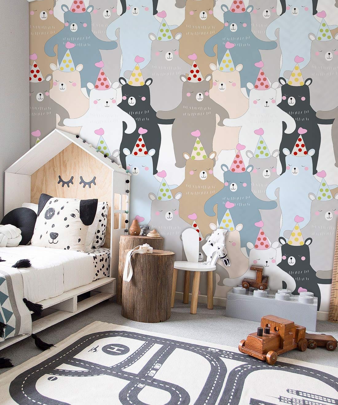 Boost the levels of energy and happiness in your place by our dancing bears mural. The pastel colours wallpaper will add a soothing effect to your kids鈥?room, and at your nursery keep the children also engaged by these party bears. Show them the friend ship in this mural and how everyone is dancing with love and they all wearing party hats so let them explain what they see, and play with them games and ask them what they think about the party these bears are attending? Our murals are available in different kinds so choose what suit your need and let us handle the rest with our talented team, don鈥檛 worry about the choice, tell us just what your dream of and we will bring it to your hands.