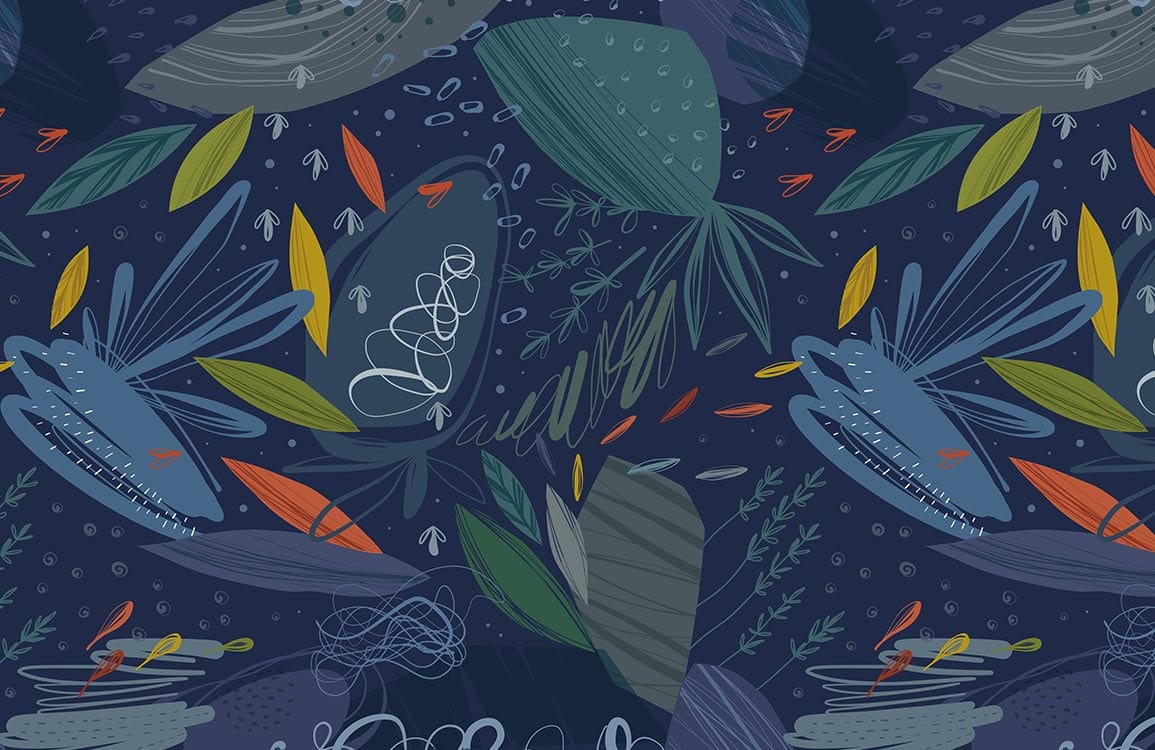 Delve into a sophisticated botanical retreat with the Dark Blue Leaves Wallpaper Mural. The deep, rich blue background is beautifully interwoven with a tapestry of abstract foliage and delicate patterns in muted greens and vibrant oranges, creating a stunning visual narrative. This mural adds a touch of elegance and an artistic flair to any room, complementing both modern and classic styles seamlessly.