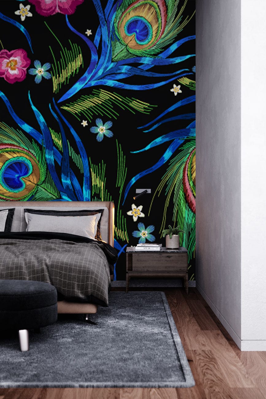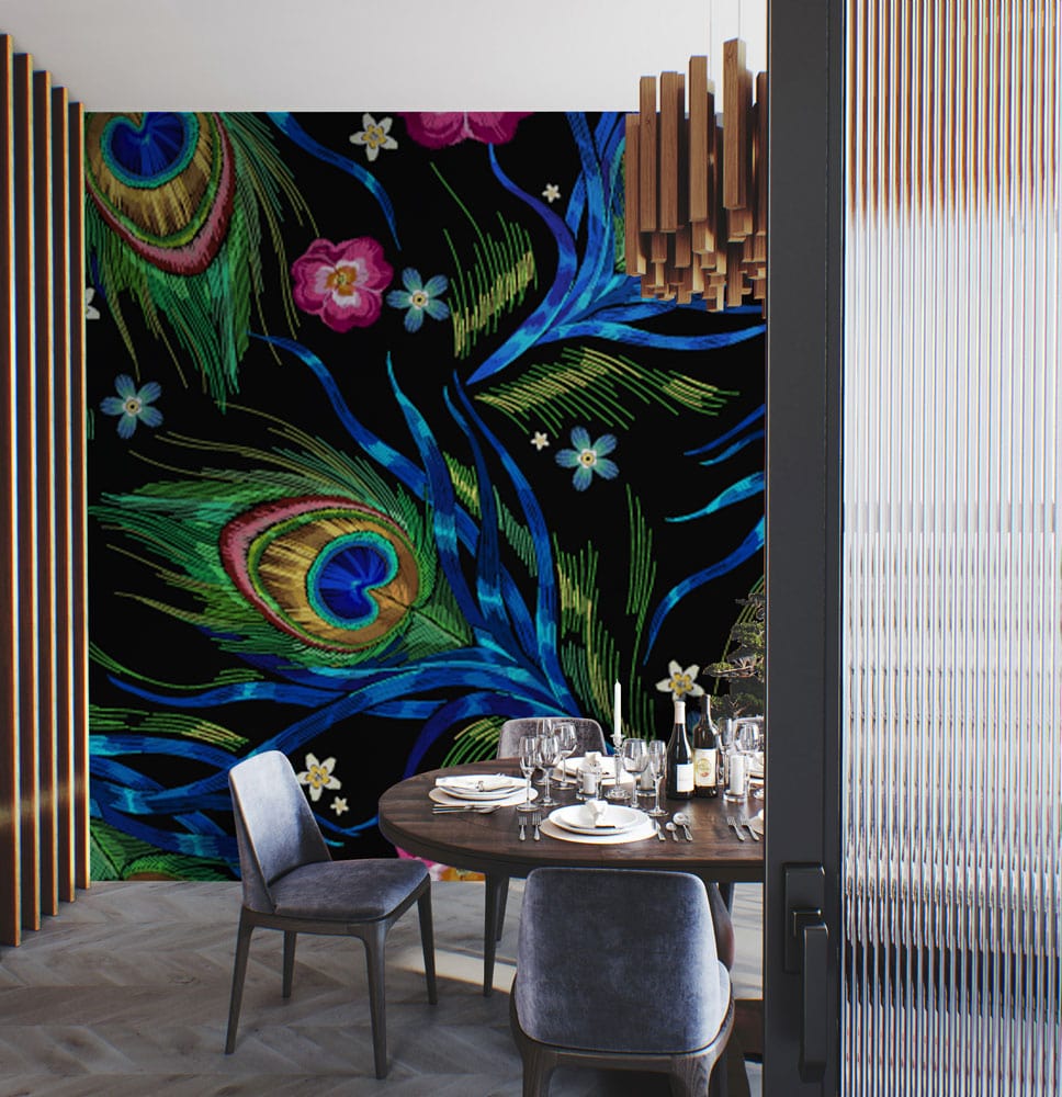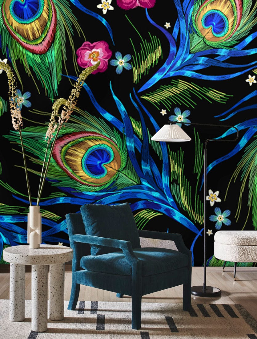 Immerse your interiors in the opulence of dark embroidery with this Peacock Feather Wallpaper Mural. The dynamic interplay of intricate peacock plumes and delicate floral motifs on a deep black canvas creates a breathtaking visual tapestry. Its rich textures and vivid hues offer a perfect harmony of elegance and artistry, seamlessly suitable for a range of interior styles from classic to eclectic.
