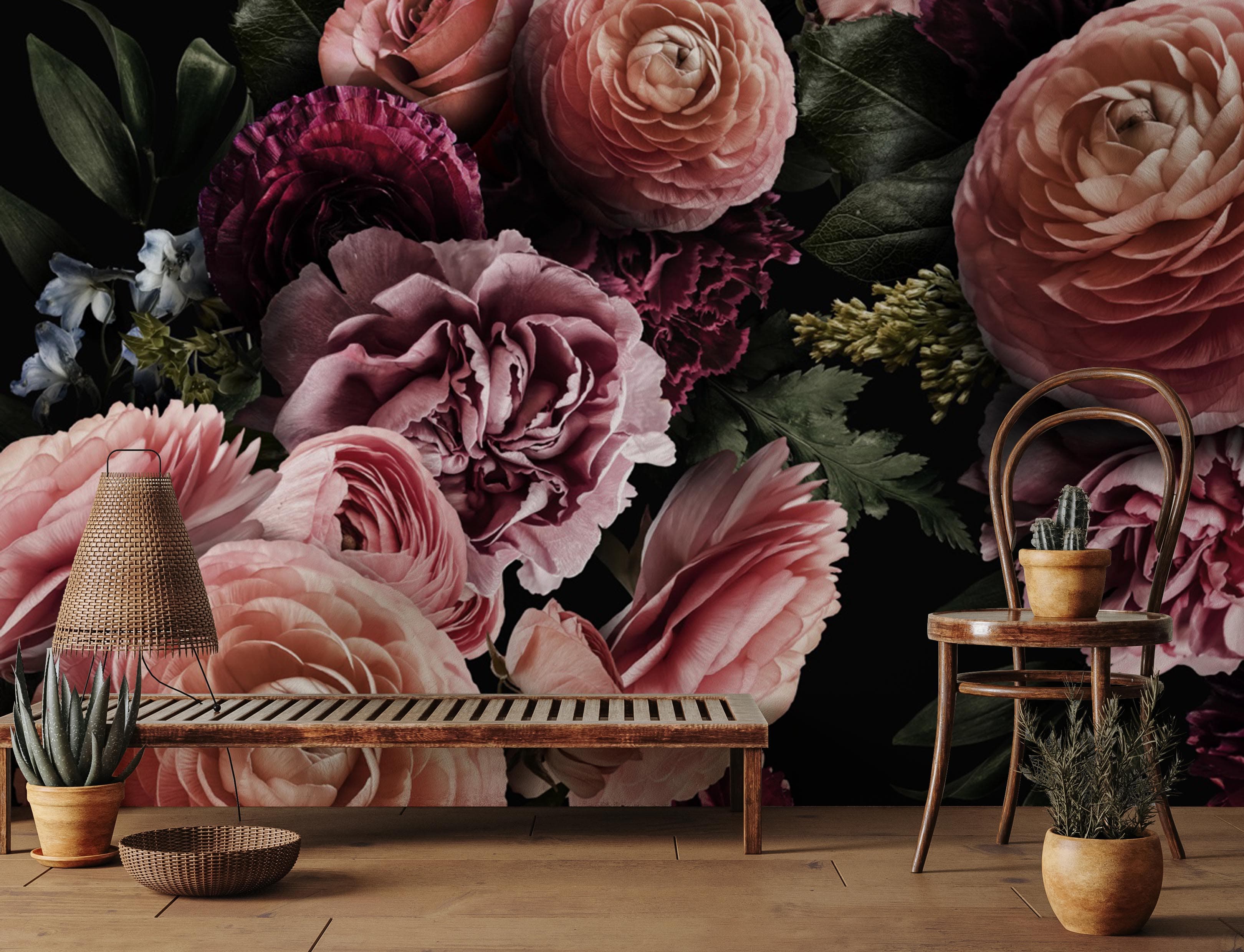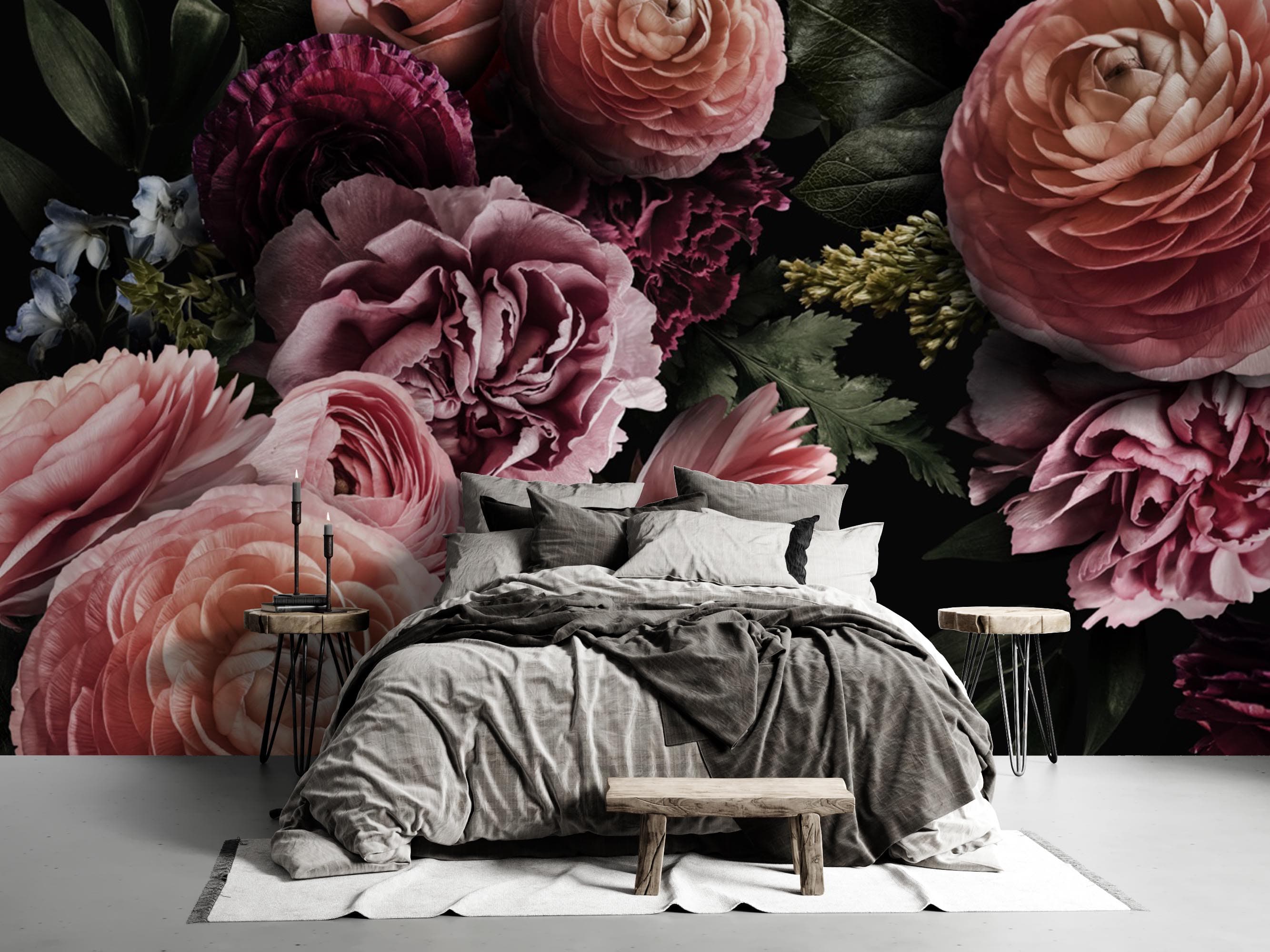 Create an elegant space in your home with our flower wallpaper mural. This beautiful flower bouquet in dark tone will surely add a touch of calm and elegant to your home. It will look amazing in your bedroom, dining room and hallway. This wall mural will also perfectly match your furniture and any other home decorations.
