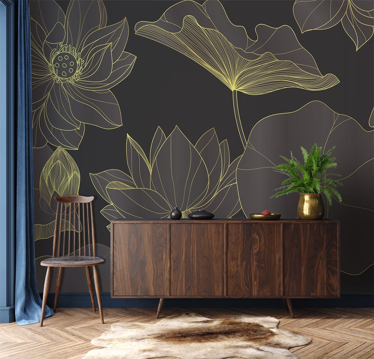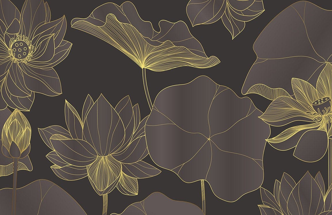 Immerse your space in the tranquil elegance of the Dark Golden Lotus Wallpaper Mural. With its exquisite depiction of lotus flowers, it intertwines delicate golden lines and dark, muted backgrounds, creating a serene and sophisticated atmosphere. Each artistic detail invites contemplation, making it an ideal choice for diverse interior styles, whether vintage charm or modern simplicity.