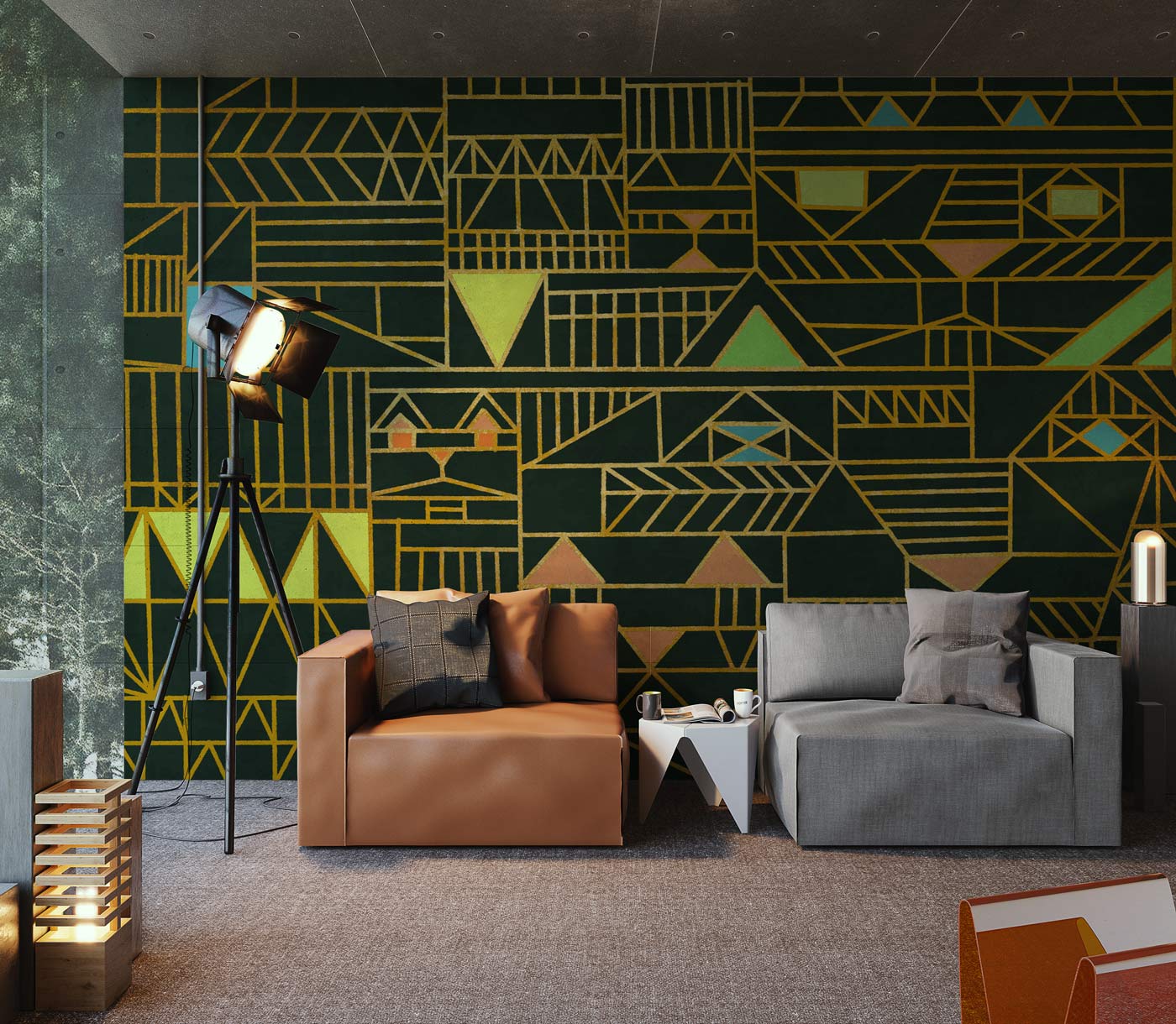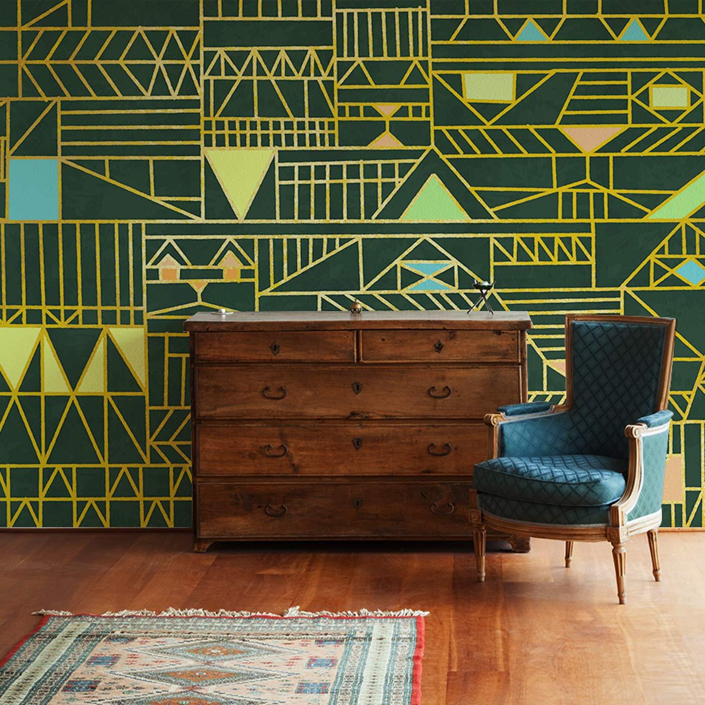 The Geometric Pattern II Wallpaper Mural captivates with striking angular designs, weaving intricate patterns in luscious shades of gold, teal, and soft blush. Its refined geometry adds a touch of sophistication and depth, creating an inviting atmosphere suitable for diverse settings, from a stately living room to a chic boutique office.