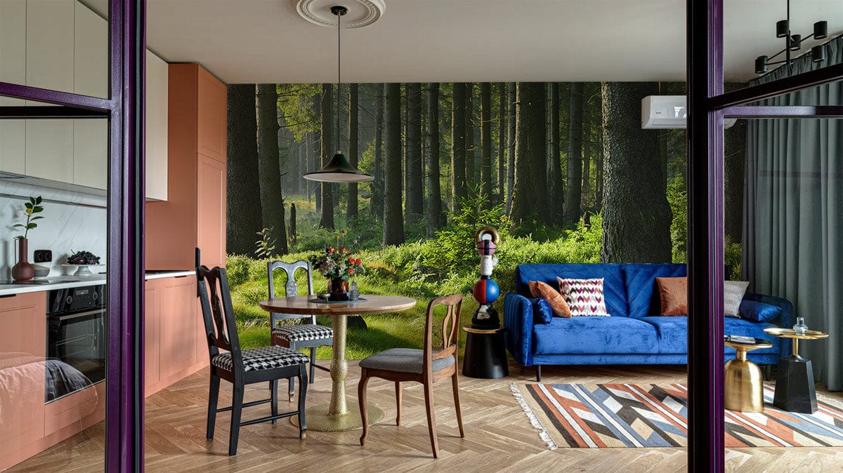 Get lost between the woods and forget about all your issues. These lovely green woods will give a vibrant effect to your place., with our deep in the woods design wallpaper. Your place will look so relaxing and so modern, the design is so different because it has depth and energy. Greens give positive energy and charge the soul with clear fresh power so make sure that you sue this mural at a place that you want to feel the energy and the hype all around you, this mural is on trend so you can use it at office, living room and also a bedroom and use decoration colours from the same colour palette of the design.