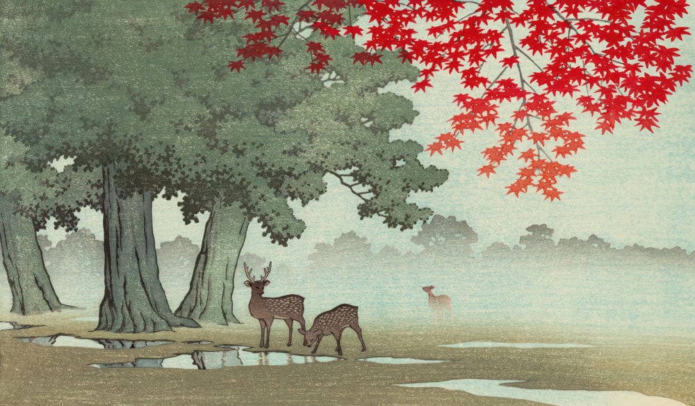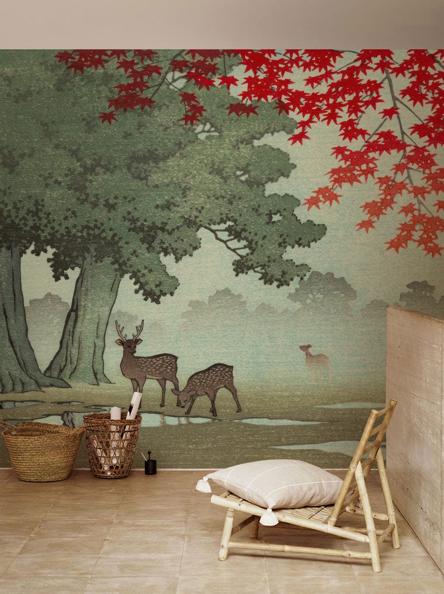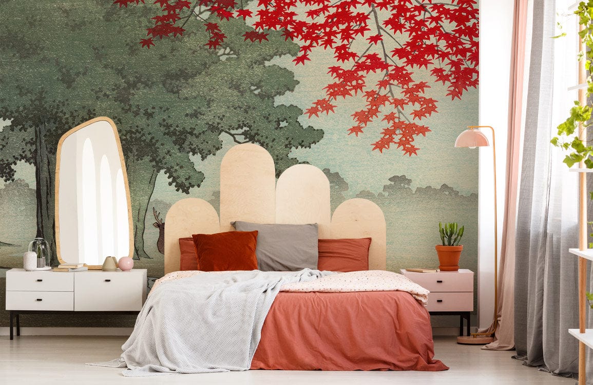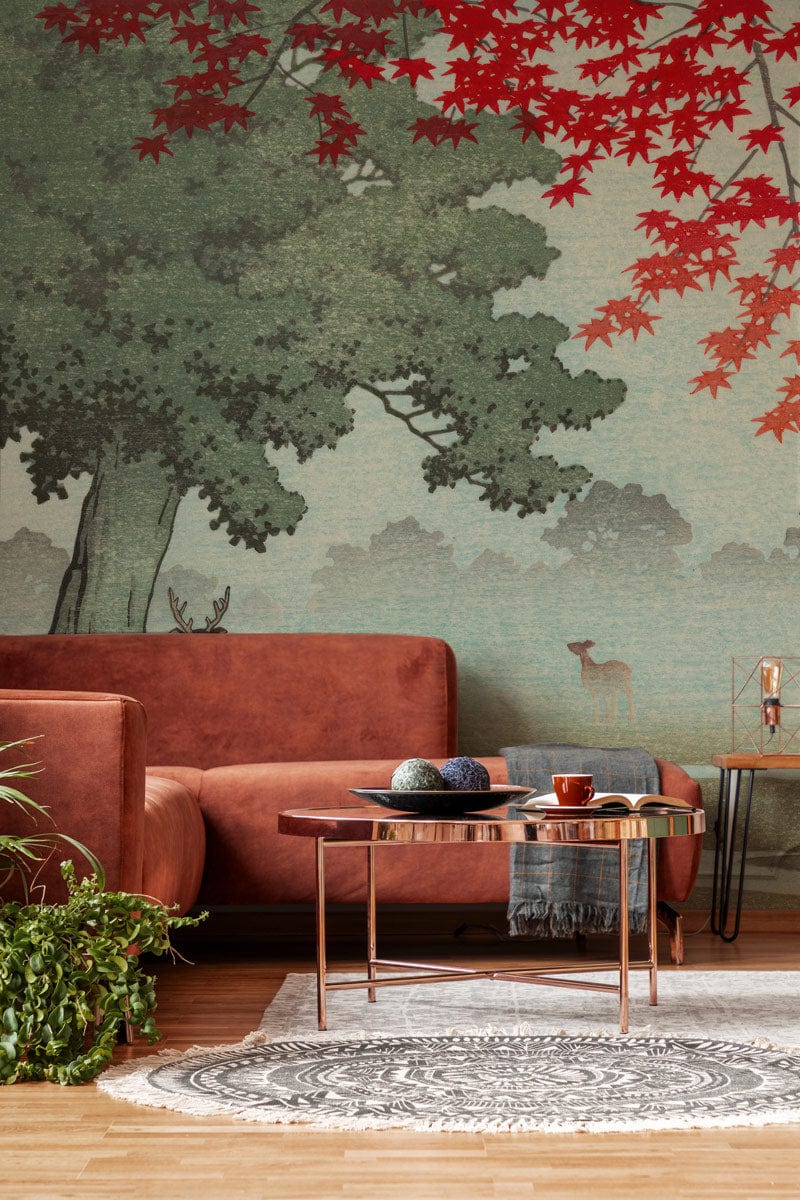 Immerse yourself in the serene beauty of nature with the Deer in Autumn Forest Mural Wallpaper. This intricate design captures the quiet elegance of deer meandering through a misty forest, framed by vibrant red and subtle green foliage. Each brushstroke evokes a sense of tranquillity, making it a sophisticated addition to a variety of spaces. The gentle interplay of colours and textures creates a timeless ambience that's perfect for any interior setting.