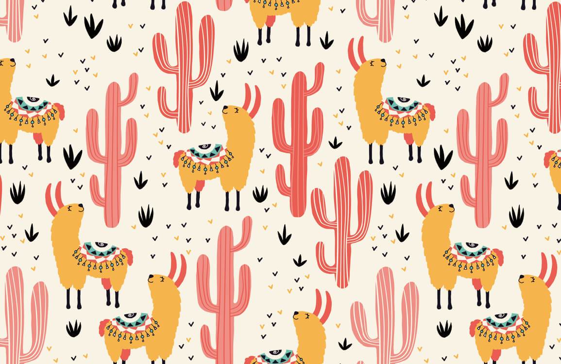 Immerse your space in the whimsy of our Desert & Animal Wallpaper Mural, where cheerful llamas gracefully mingle amidst vibrant cacti. The playful dance of patterns adds a touch of lively charm, perfect for creating an inviting atmosphere. With its harmonious design and cheerful hues, this mural is an exquisite choice for many interiors, from contemporary settings to eclectic spaces.