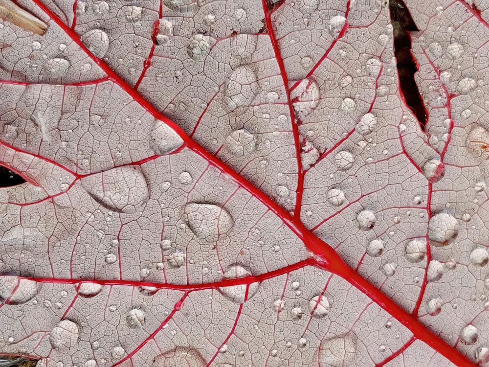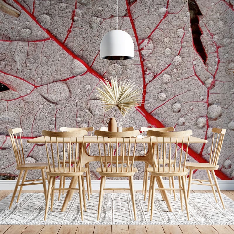 Immerse yourself in the tranquillity of nature with the Dew on Red Leaf Wallpaper Mural. This exquisite design captures the intricate lacework of vibrant red veins winding across muted grey leaves, accentuated by delicate dew droplets that add a refreshing texture. Its sophisticated charm pairs beautifully with a variety of interior styles, creating a serene ambience that resonates with any room.