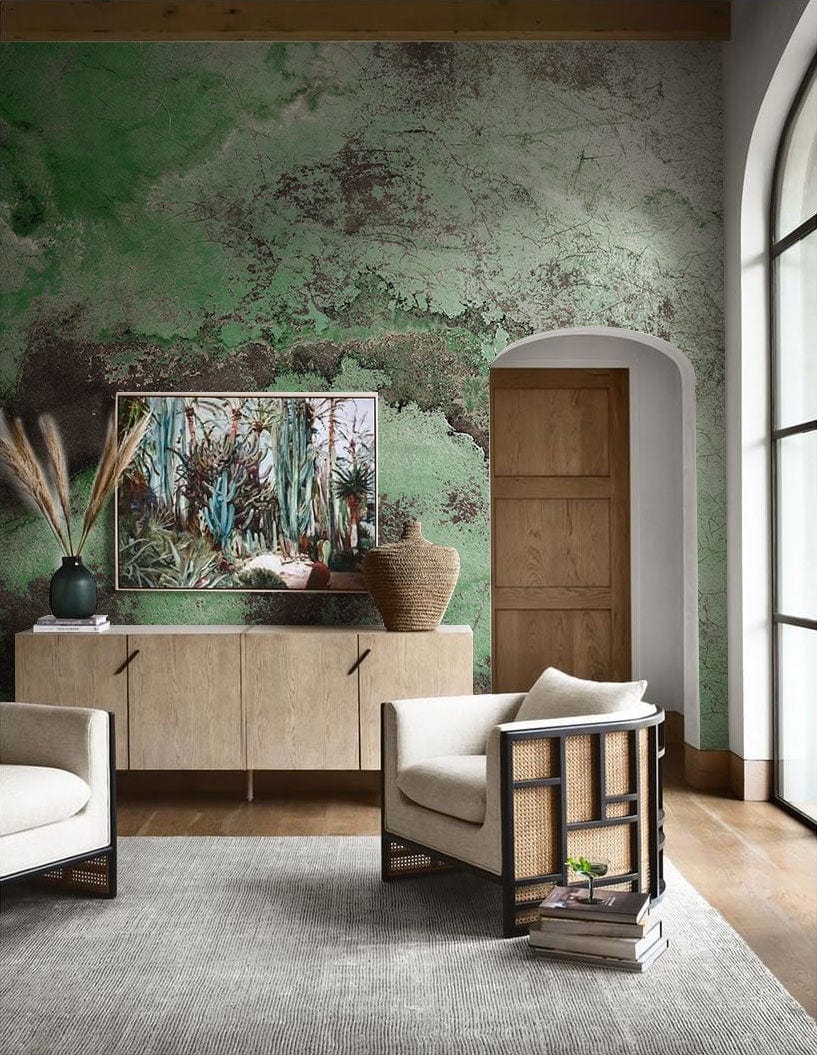 Discover the timeless charm of the Dilapidated Green Floor Wallpaper Mural. Its design evokes the serene beauty of aged patinas, with rich, green hues intermingling with earthy tones, suggesting stories untold. The textured surface adds depth, invoking a tactile experience akin to wandering through an ancient forest. Ideal for spaces seeking a touch of artistic elegance and vintage allure.