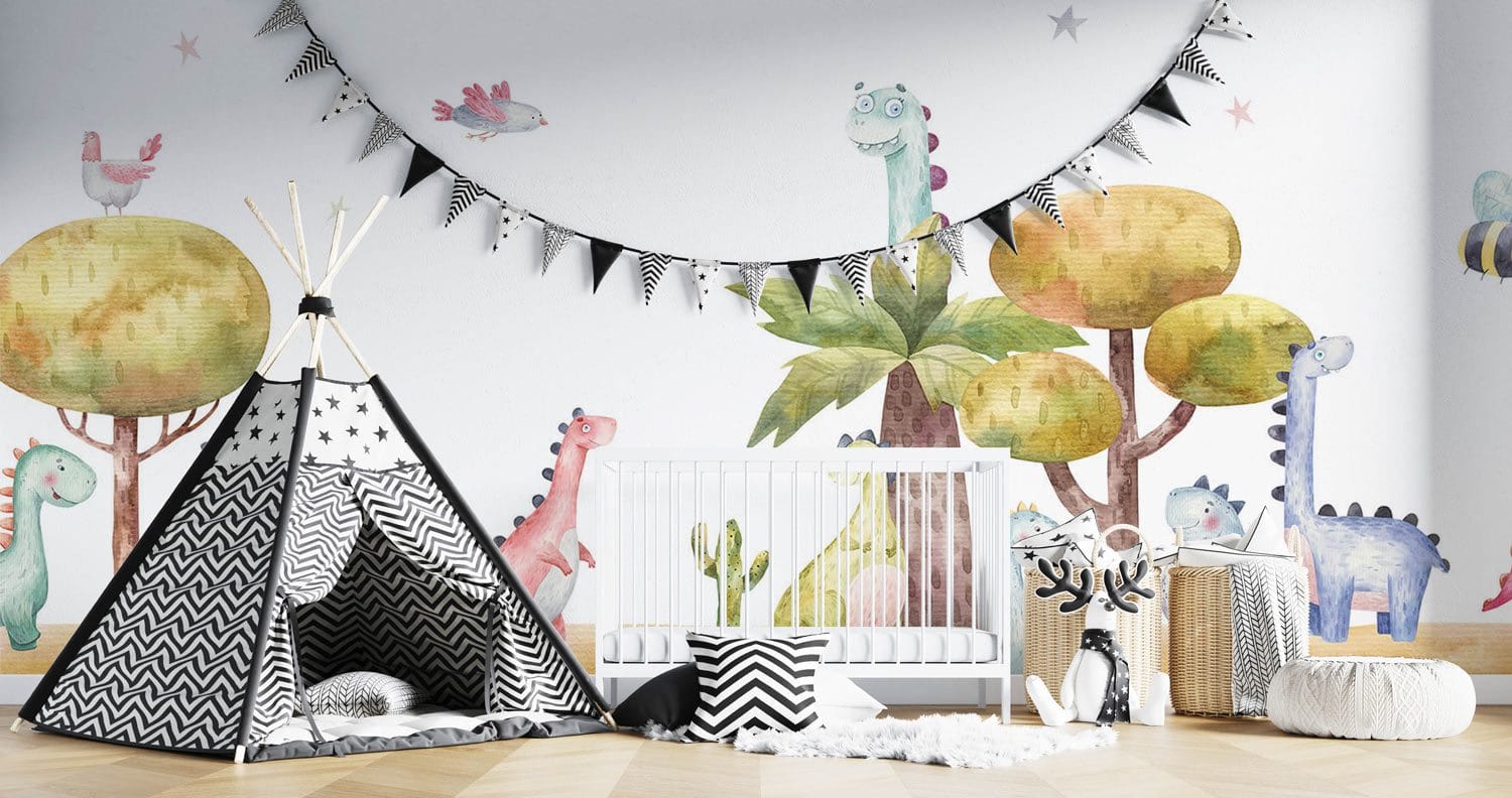 Welcome to the dinosaur park. This dinosaur wallpaper mural isone of the most popular wall mural among children. This beautiful, amazing painting of a stunning, wild park will be perfect for the indoors in your home. Interesting rendering with a natural atmosphere and a refreshing wall decoration perfect for your kid's room.