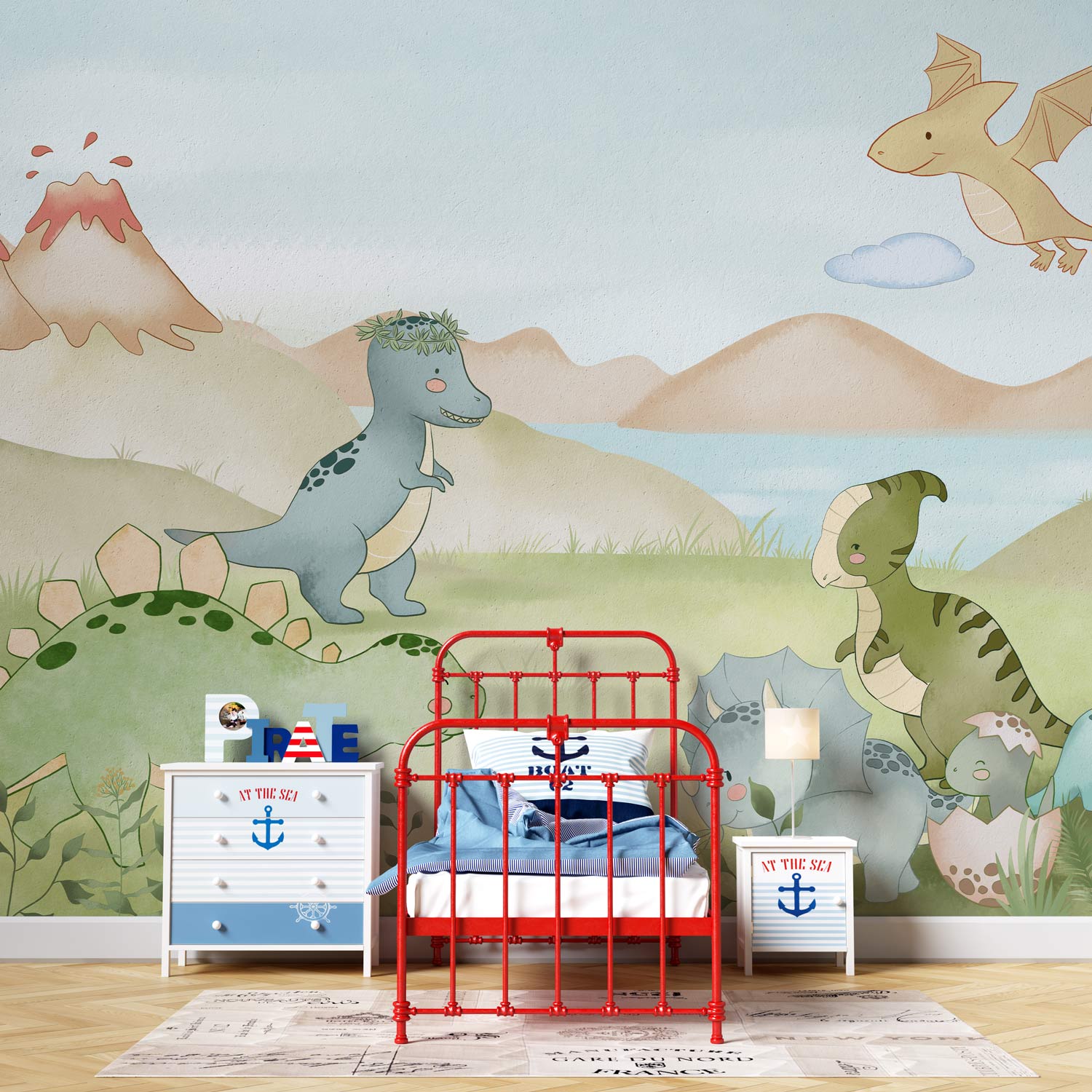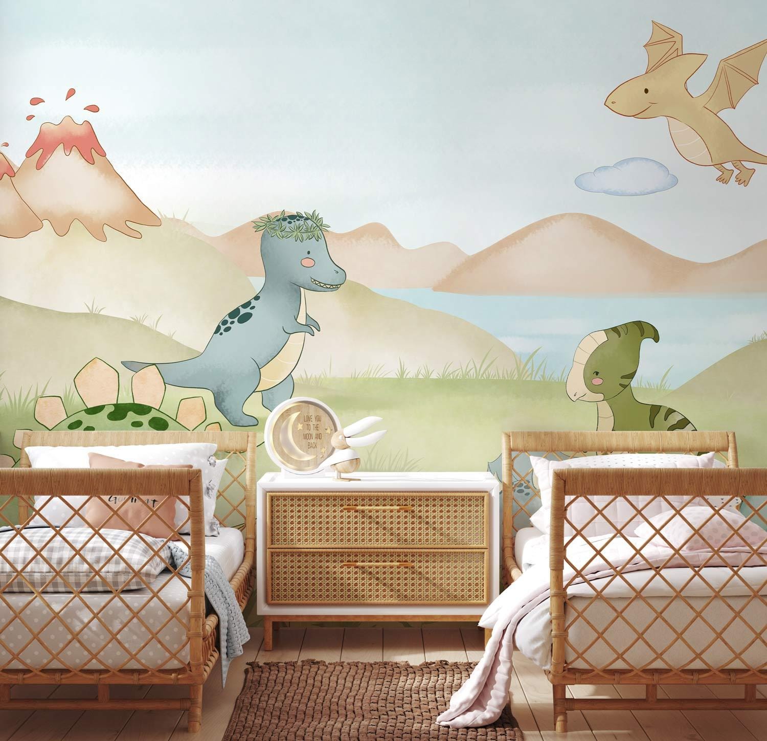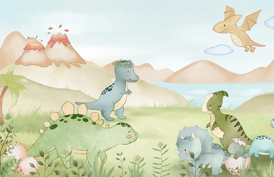 Step into a whimsical prehistoric world with this delightful Dinosaurs Wallpaper Mural. Featuring a gentle landscape adorned with charming dinosaur illustrations, volcanic mountains, and lush flora, this mural offers a captivating blend of storytelling and artistic detail. With soft hues and intricate textures, it evokes a sense of nostalgia while maintaining a modern edge, making it a perfect fit for both children's spaces and sophisticated living areas.