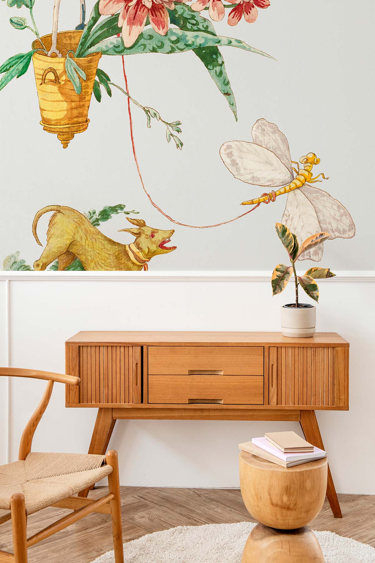 This exquisite 'Dog Chasing Insects' wallpaper mural captures the essence of playful whimsy and timeless elegance. Detailed artistry brings to life a charming scene where a curious dog frolics with a delicate insect. Soft earth tones and gentle greens create a harmonious backdrop, adding a touch of nature's mystique to any interior space. Ideal for those seeking an artistic blend of narrative and subtlety, this mural is perfect for inviting warmth and personality into your surroundings.