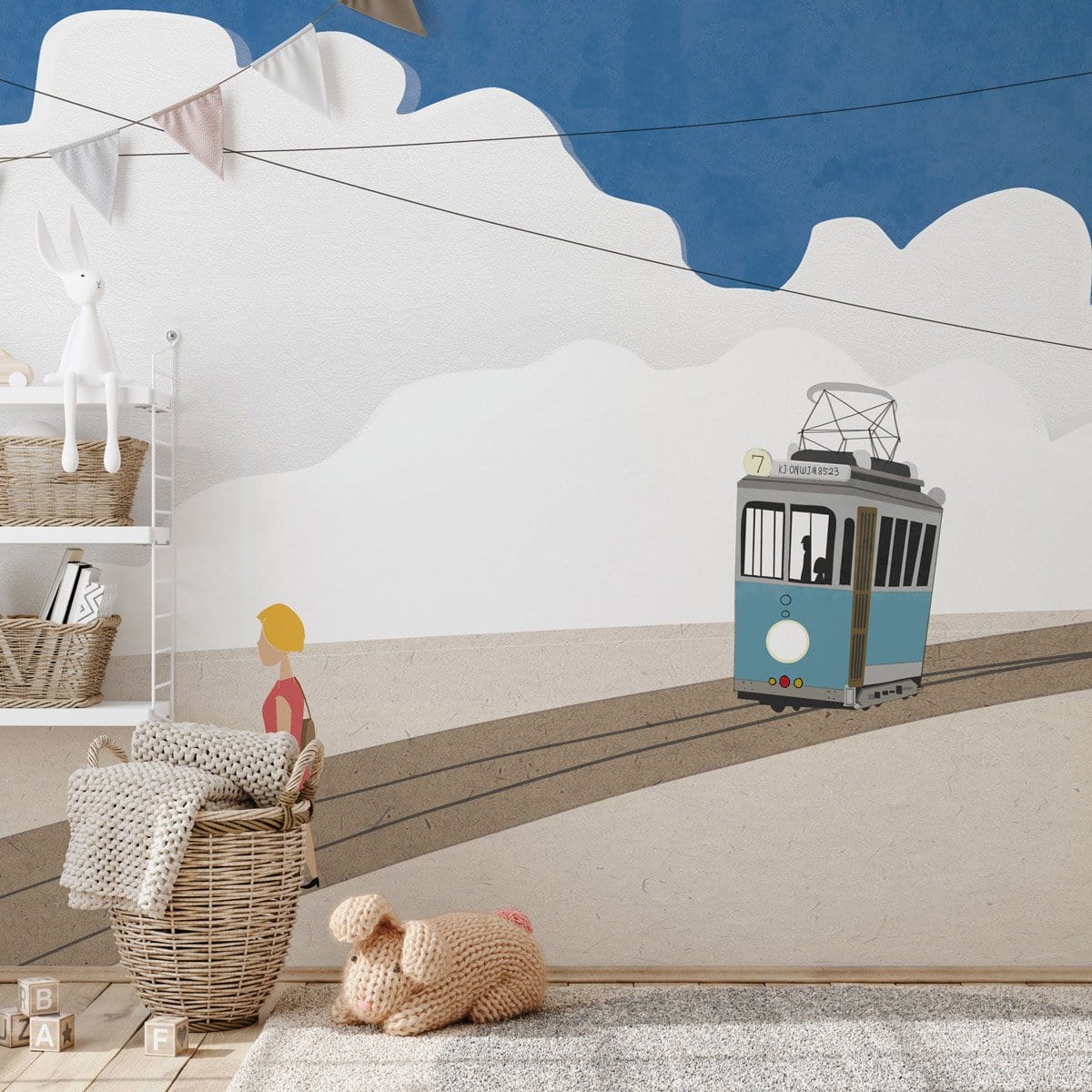 The Dreamland Wallpaper Mural evokes a serene journey through vintage charm with its artful depiction of a tram and a solitary figure under a sky reminiscent of a classic fresco. The mural spans a canvas of captivating blues and earth tones, offering a sense of calm and nostalgia that complements both contemporary and traditional settings. Its subtle textures and balanced composition create a seamless fusion of art and atmosphere, ideal for adding depth to any room.