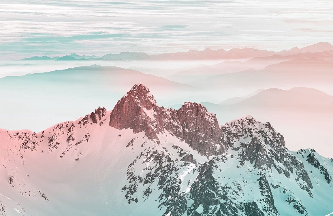 Enjoy this beautiful dreamy snow mountain wallpaper mural in your home. The pastel pink sunset glow with min green snow mountain together cast an air of magnificence to your space. Use this in your living room or the dining room with your bright coloured furniture and get enchanted by your tasteful interior choices.