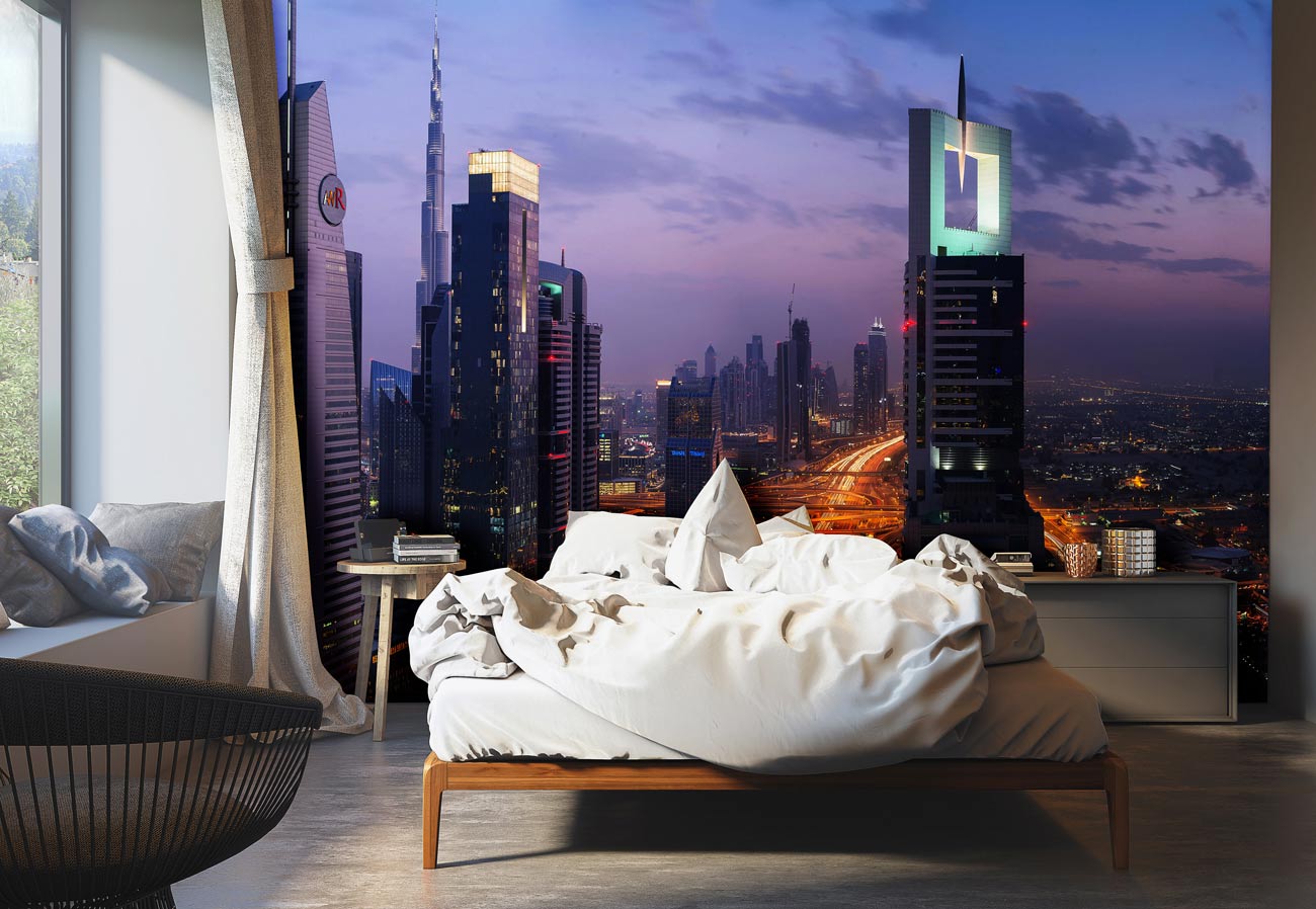 Watch the sunset, look out to sea, and gaze at the night sky as you relax in your home. Our Dubai Night Wallpaper Mural creates a beautiful view of the city while adding colour to your home. Featuring a stunning view of the skyline of Dubai at night, this mesmerizing wall mural is the best focal point for a room that needs something special. A perfect addition to any modern home or a great gift for someone who has everything but loves Dubai, this design can do both based on your needs.