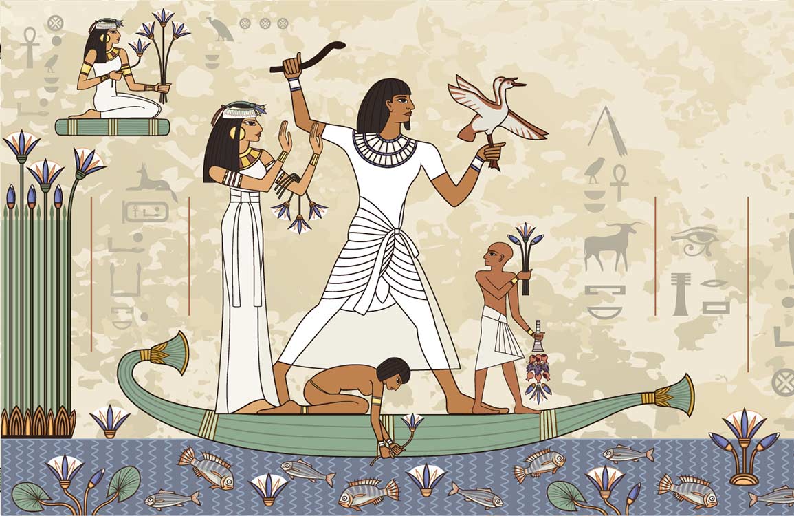 Experience the elegance of ancient Egyptian artistry with this exquisite wallpaper mural. Featuring vivid depictions of regal figures and intricate hieroglyphics, it serves as a captivating focal point. The muted background, adorned with delicate lotus motifs and enigmatic symbols, creates a sophisticated ambiance that enriches a range of interiors, from classic to contemporary.
