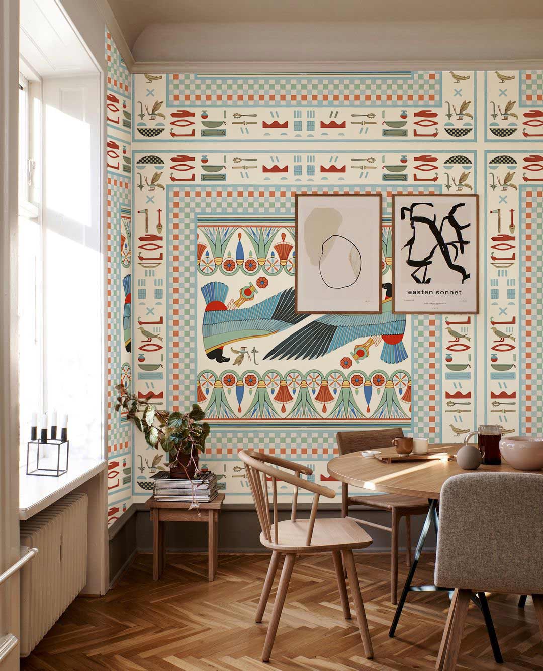 Immerse your space in the timeless allure of ancient Egyptian artistry with this exquisite wallpaper mural. Intricate symbols and motifs dance in harmony, reflecting a legacy of opulence and mystery. Richly detailed patterns in a tapestry of colour create a compelling visual narrative, seamlessly bridging the past with the present. Perfect for elevating both intimate and expansive interiors.