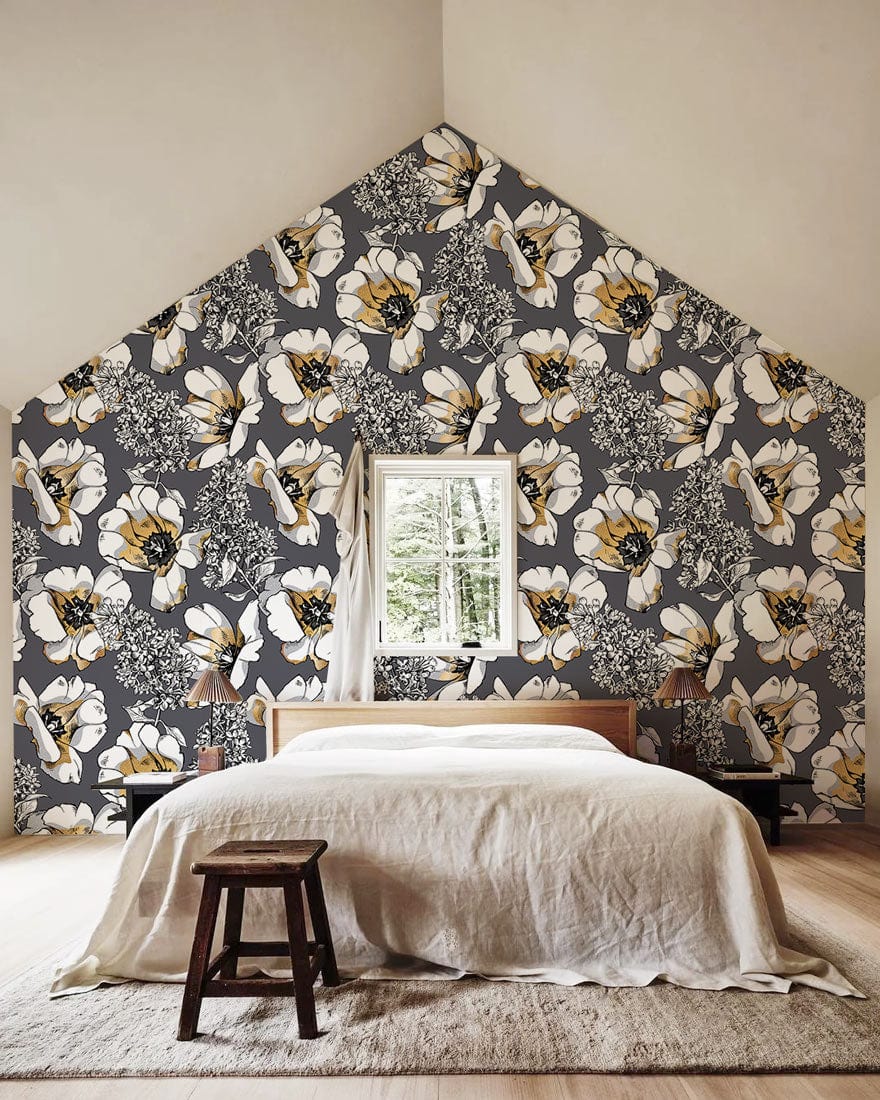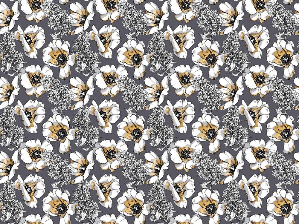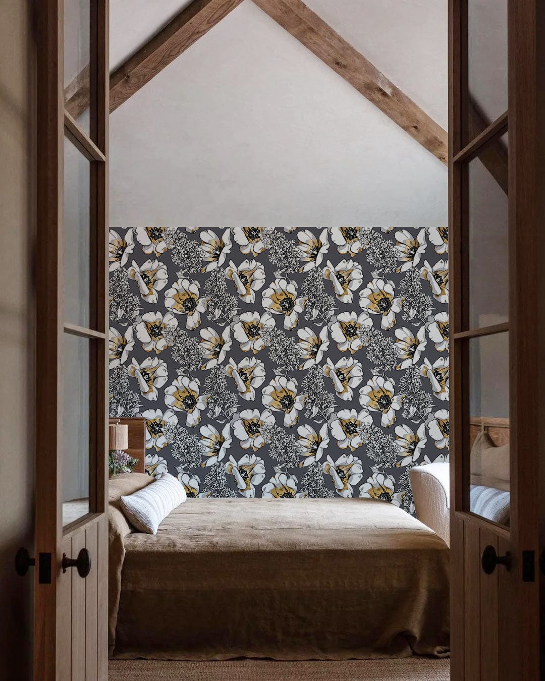 The Elegance Blooms on Charcoal Grey Mural Wallpaper captures a sophisticated tableau of delicate floral artistry. Set against a deep charcoal backdrop, the intricate flowers exude an air of refined charm with their white and golden hues. This wallpaper's intricate detail and muted palette allow it to complement contemporary and classic interiors alike, creating a serene ambience in any space.
