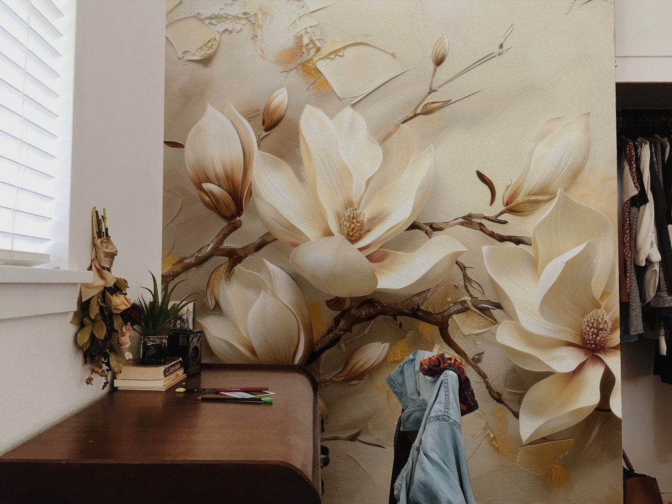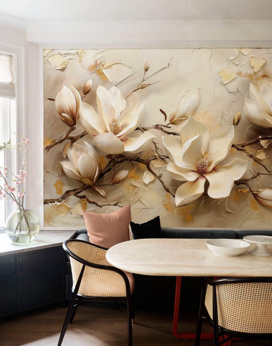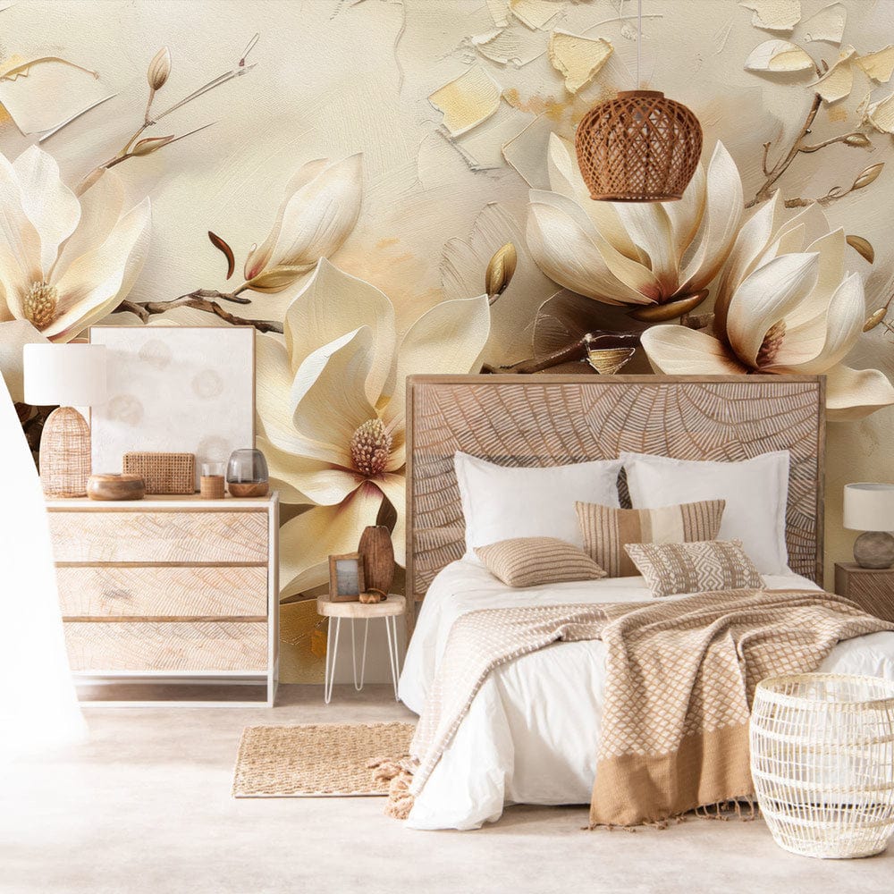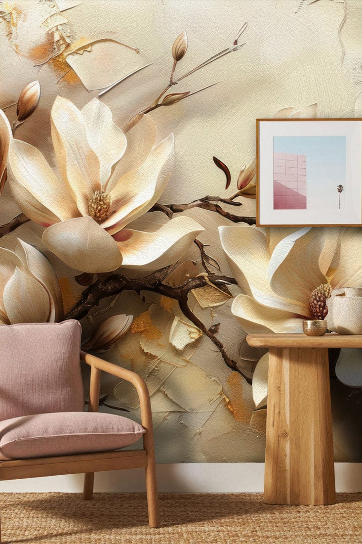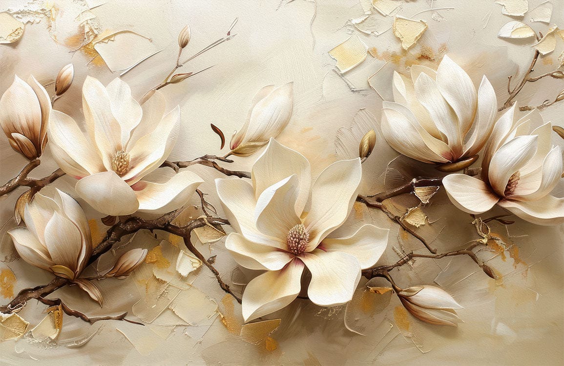 The Elegant Blossom Retreat Mural Wallpaper presents a sophisticated depiction of magnolia blooms, artistically rendered in soft, ivory hues. This mural combines textured details and muted golden accents, creating an exquisite floral tapestry that exudes a sense of serenity and timeless elegance, fitting seamlessly into a variety of interiors from classic to contemporary.