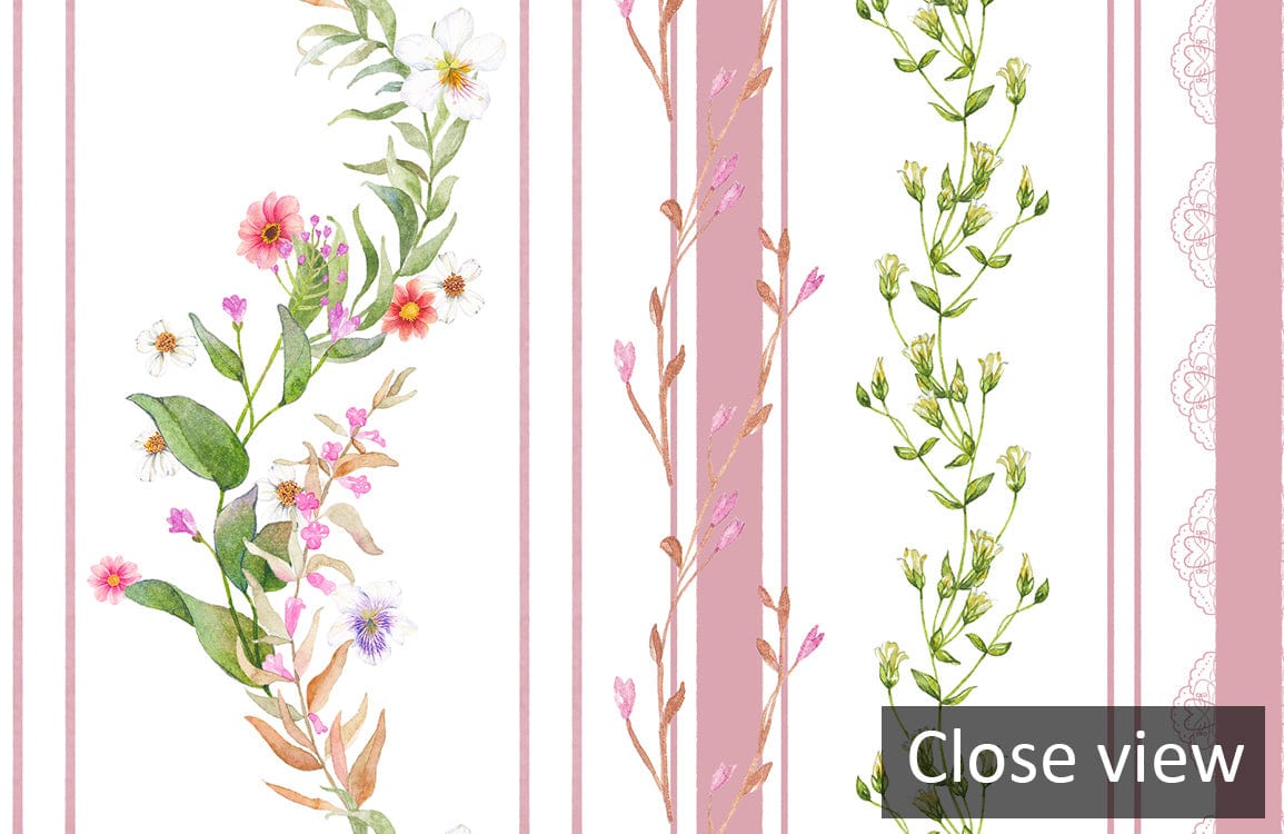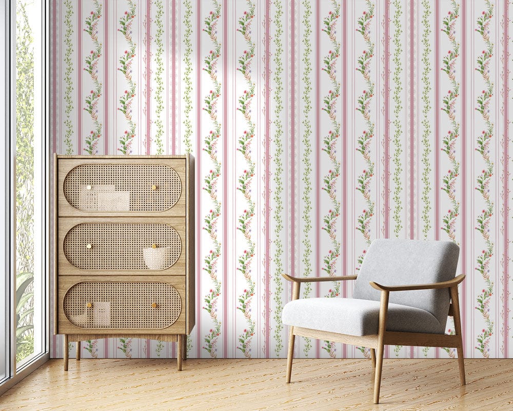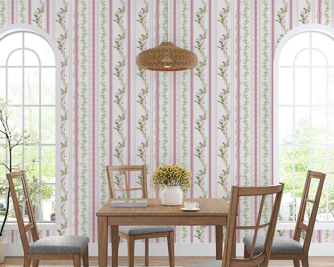 Embrace elegance with this Floral Stripe Mural Wallpaper, featuring delicate blossoms entwined with vertical stripes. Its graceful balance of soft pastels and intricate detailing creates an atmosphere of refined beauty, perfectly suited for diverse interior settings from classic to contemporary.