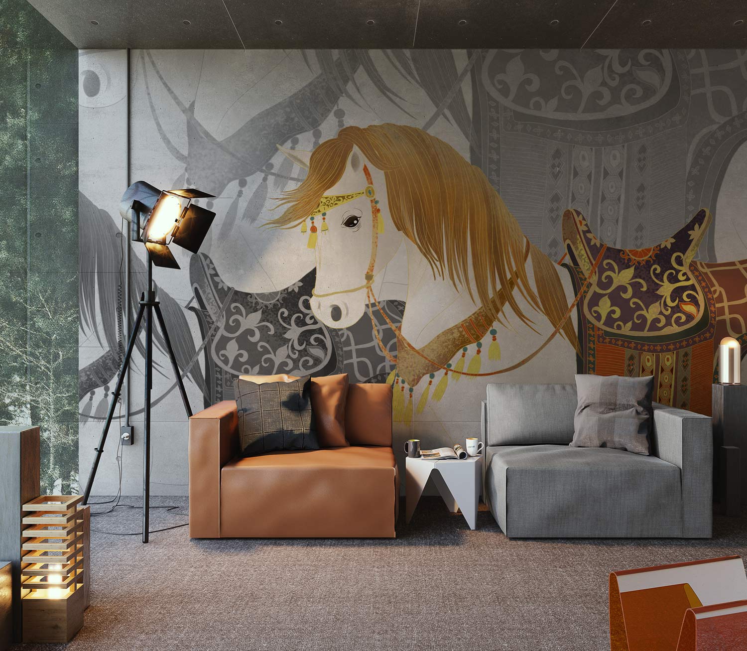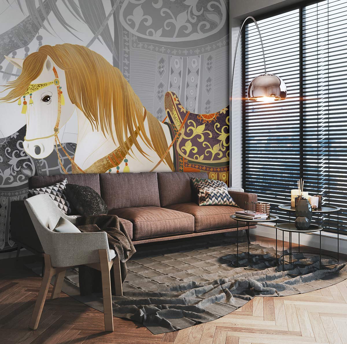 Immerse your space in the timeless elegance of the Elegant Horse Wallpaper Mural. This captivating design showcases a noble horse adorned with intricately detailed saddlery, set against a subtle grayscale backdrop. Rich in artistic texture and refined detail, this mural harmonises beautifully with diverse interior styles, seamlessly integrating into both classic and contemporary settings.