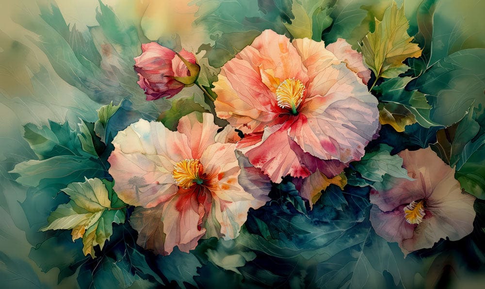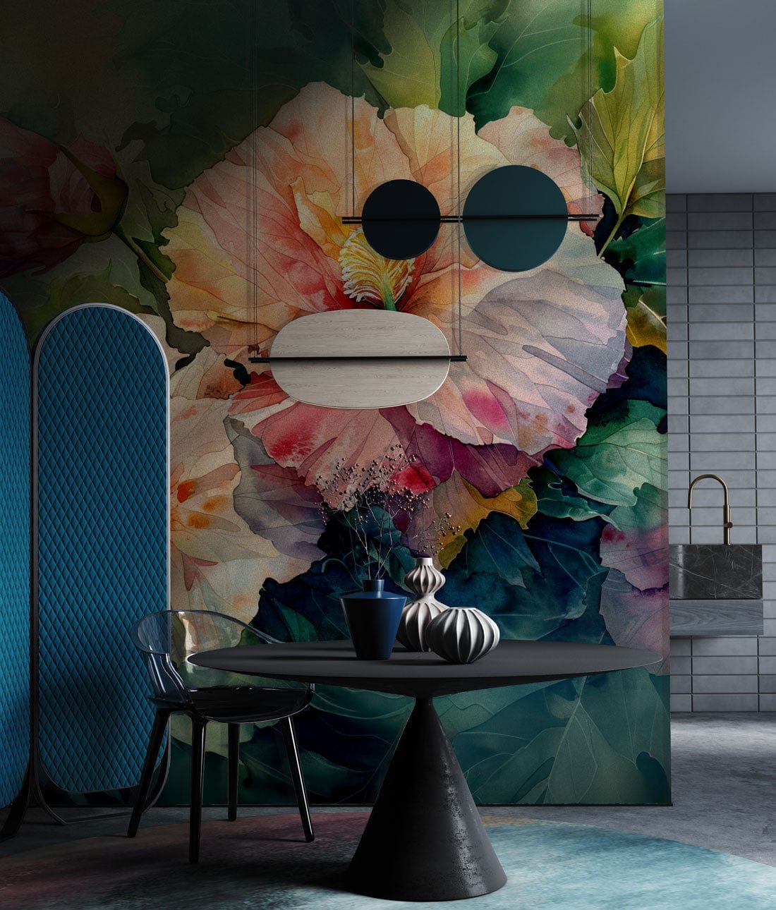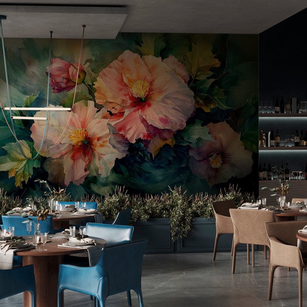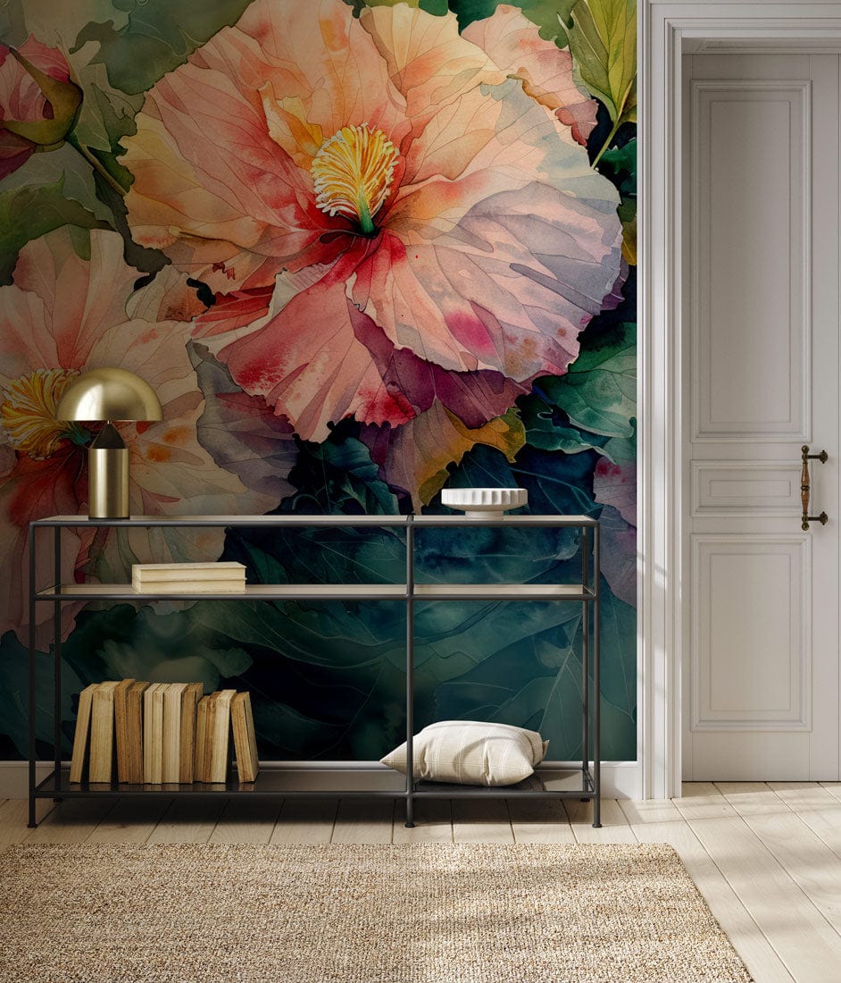 Immerse your space in the lush sophistication of this Elegant Tropical Large Floral Wallpaper. The design mesmerises with its artistic depiction of blooming hibiscus flowers and verdant foliage, capturing nature's untamed beauty. Rich textures and a harmonious palette of greens and soft pinks create an inviting ambience, perfect for creating a serene retreat or a statement backdrop. Suitable for a range of settings, this wallpaper's graceful elegance complements both contemporary and traditional interiors.