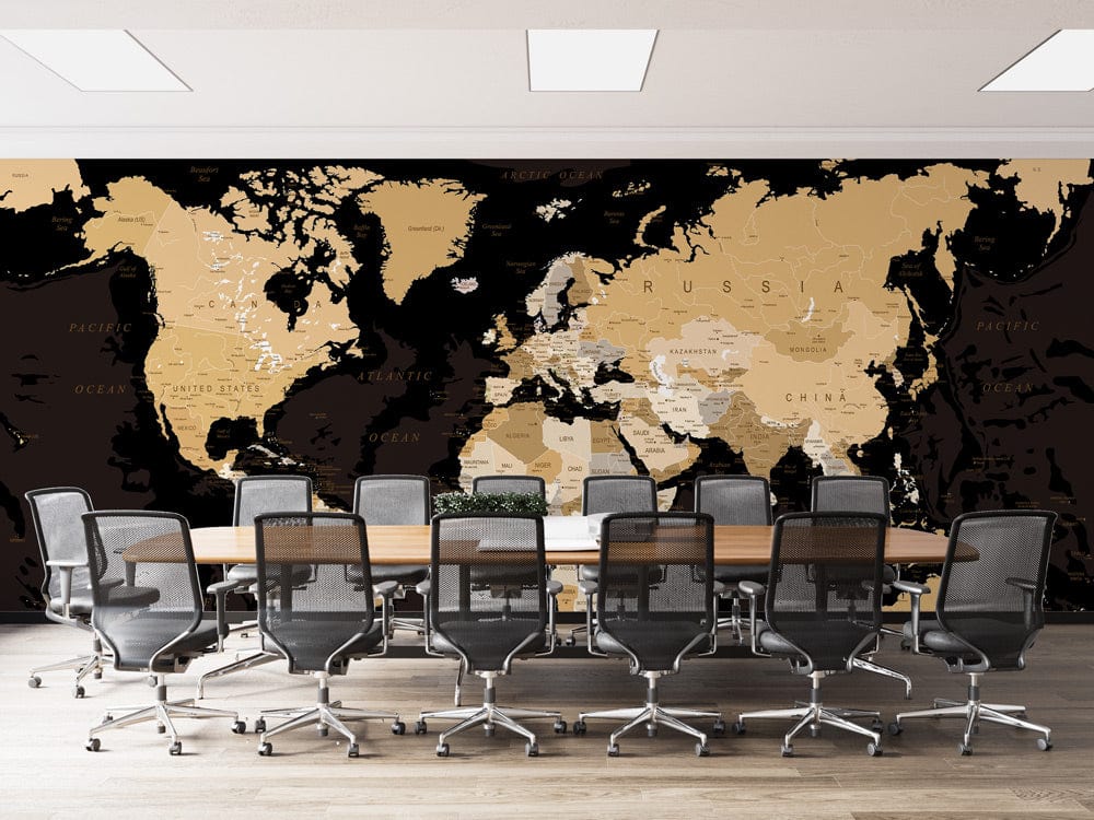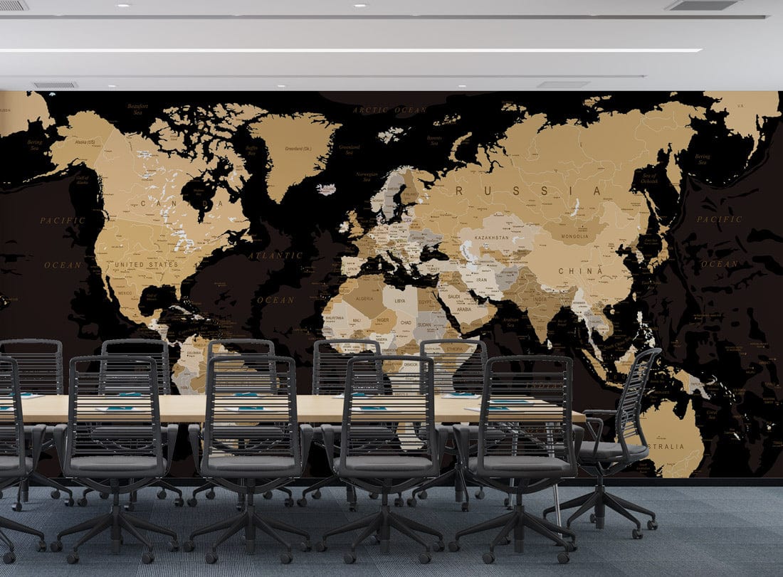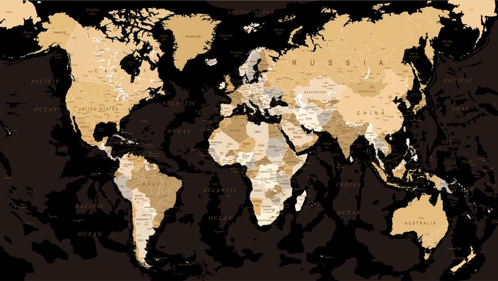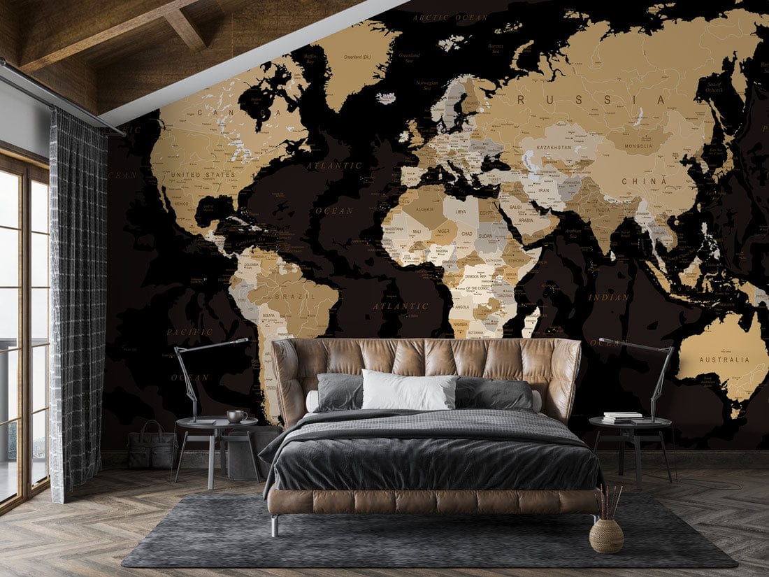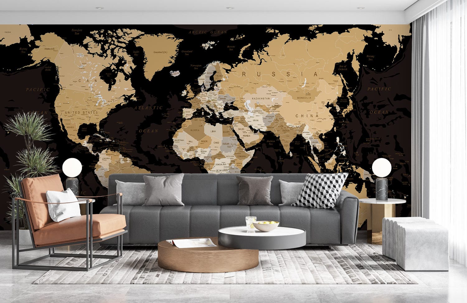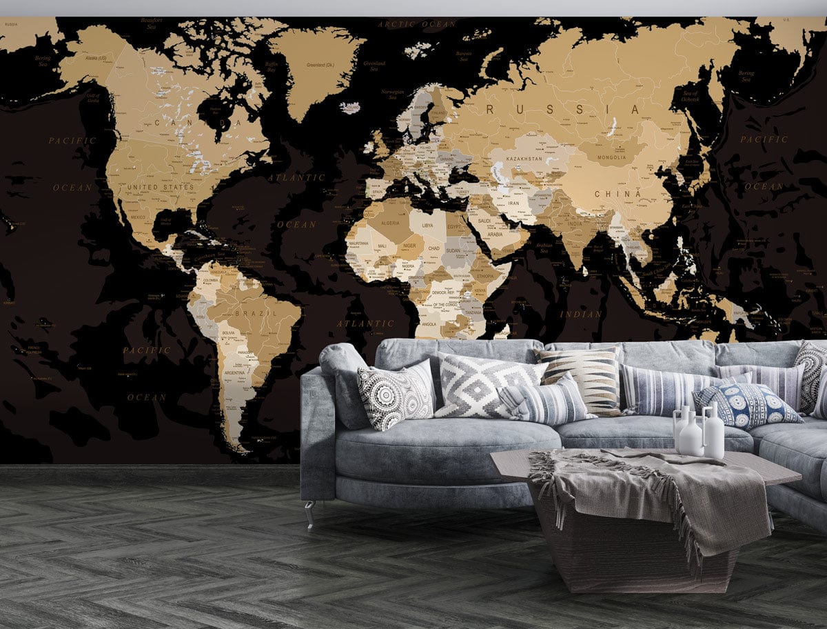 Immerse your interiors in worldly elegance with this exquisite world map wallpaper. The intricate design beautifully blends cartographic detail with luxurious style, featuring continents gracefully set amidst rich, earthy tones. This wallpaper creates an inviting backdrop that complements modern and vintage decor, making it an ideal choice for spaces seeking a refined global touch.