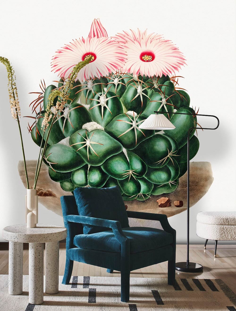 Immerse your space in the exquisite detail of the Elephant's Tooth Cactus Wallpaper Mural, where the intricate depiction of lush, verdant cacti meets soft, textural floral blooms. This mural captures the beauty of nature with a sophisticated artistry, creating an atmospheric yet refined presence that complements both classic and contemporary interiors.