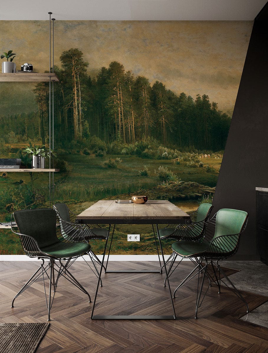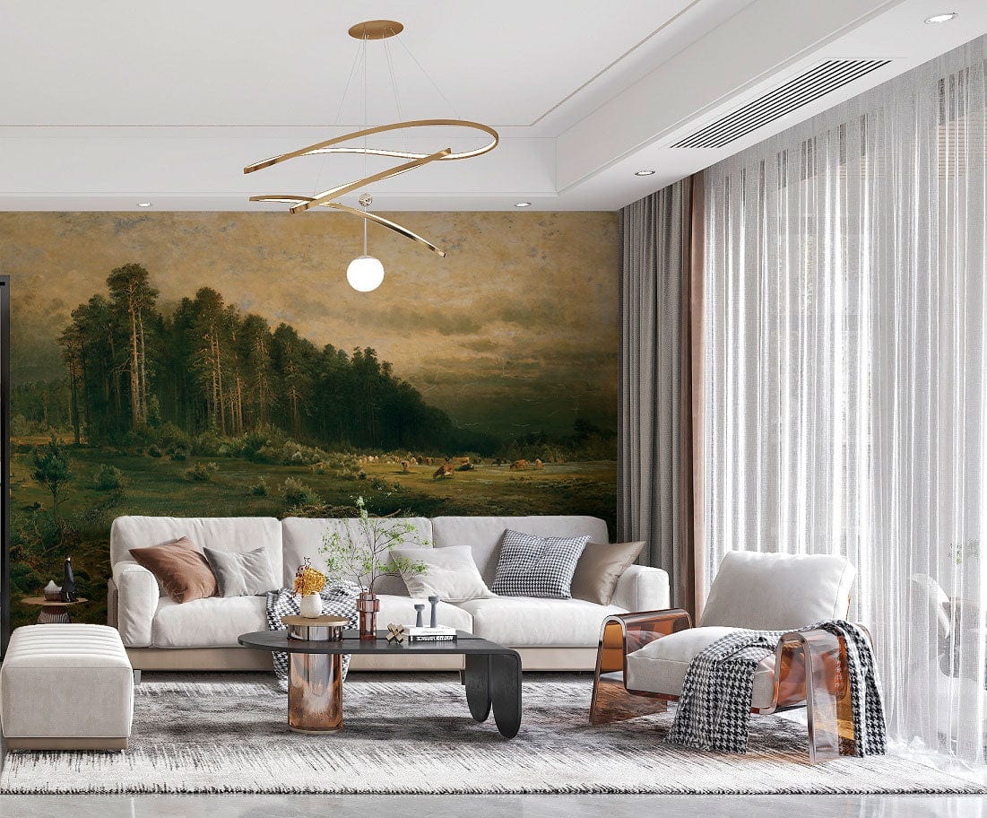 Immerse yourself in the serene beauty of Elk Island, captured exquisitely in the Sokolniki Wallpaper Mural. This piece elegantly portrays a tranquil forest landscape, where towering trees meet softly rolling terrain under an expansive sky. The detailed artistry and rich textures invite a sense of peace, offering visual depth that draws the observer into a timeless natural tableau. Ideal for adding sophistication and calm to a variety of spaces, it gracefully complements both traditional and contemporary interiors.