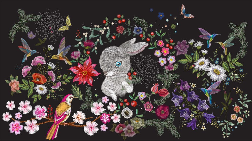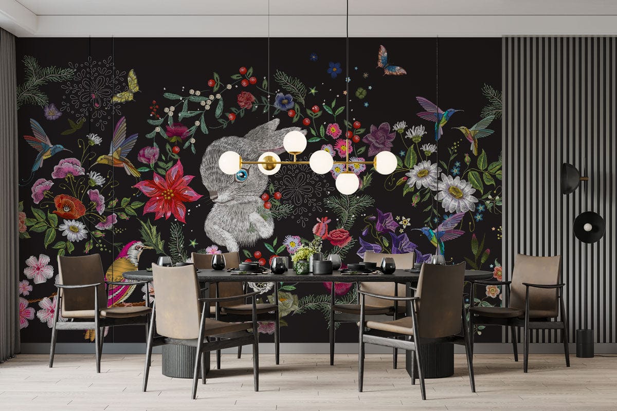 This exquisite Embroidered Rabbit Wallpaper Mural captivates with its intricate artistry, showcasing a charming rabbit surrounded by vibrant florals and whimsical birds. Each element seemingly springs to life against a deep background, offering a captivating tapestry that evokes both wonder and elegance. The delicate embroidery look enriches the texture, inviting a timeless sophistication to any interior.