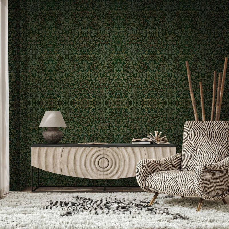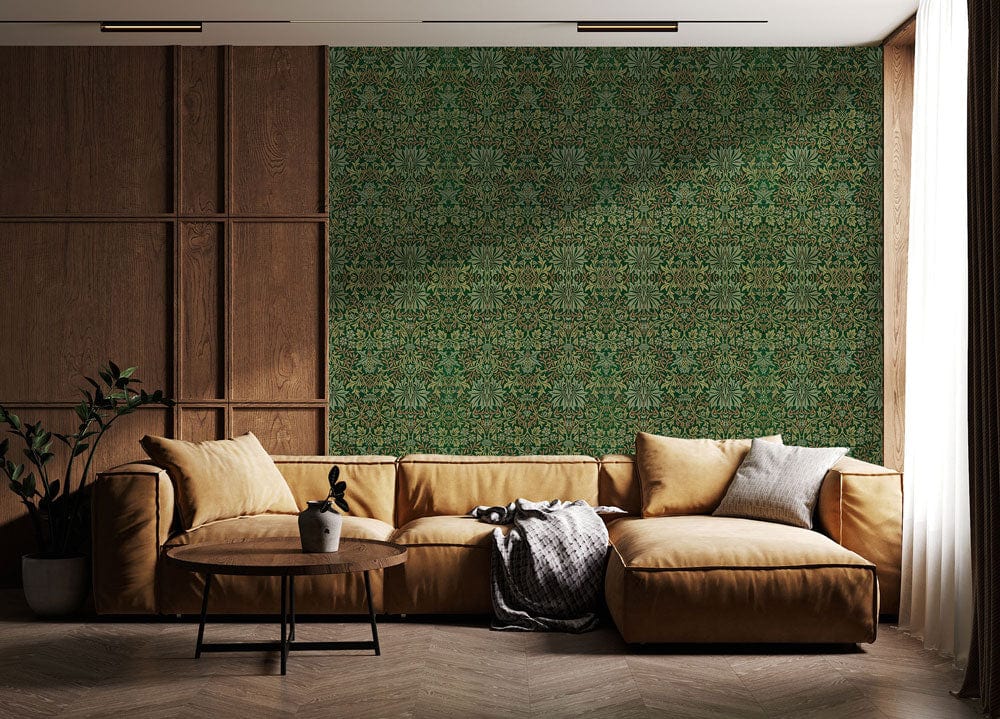 The Emerald Tapestry Garden Mural Wallpaper weaves an intricate botanical narrative with its lush pattern of foliage and floral motifs. The depth of its design creates a serene yet sophisticated ambience that can effortlessly complement both classic and contemporary interiors. Rich in detail, it brings a touch of timeless elegance to any room, offering a visual journey into a world where nature and artistry converge.