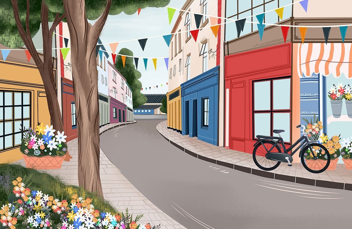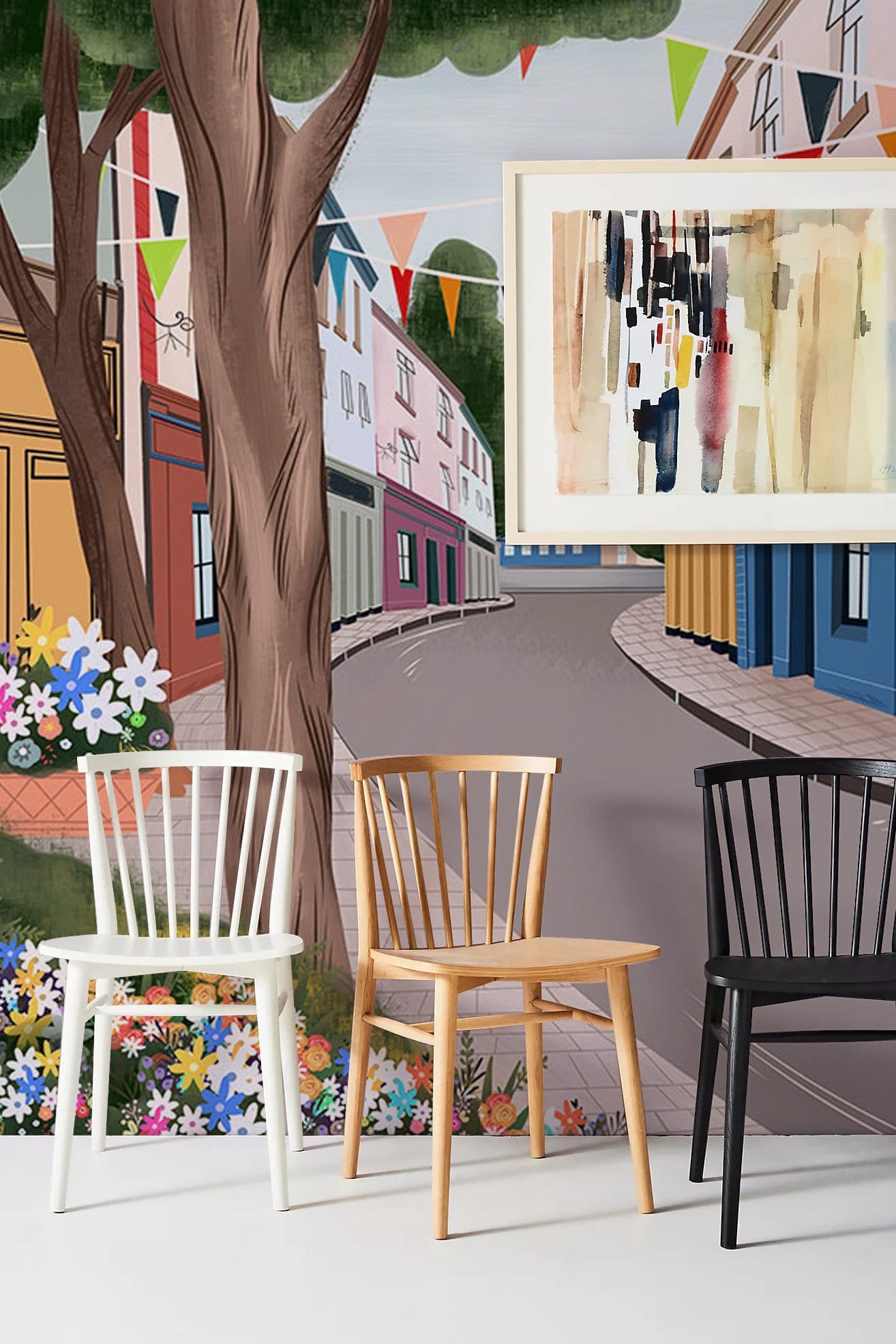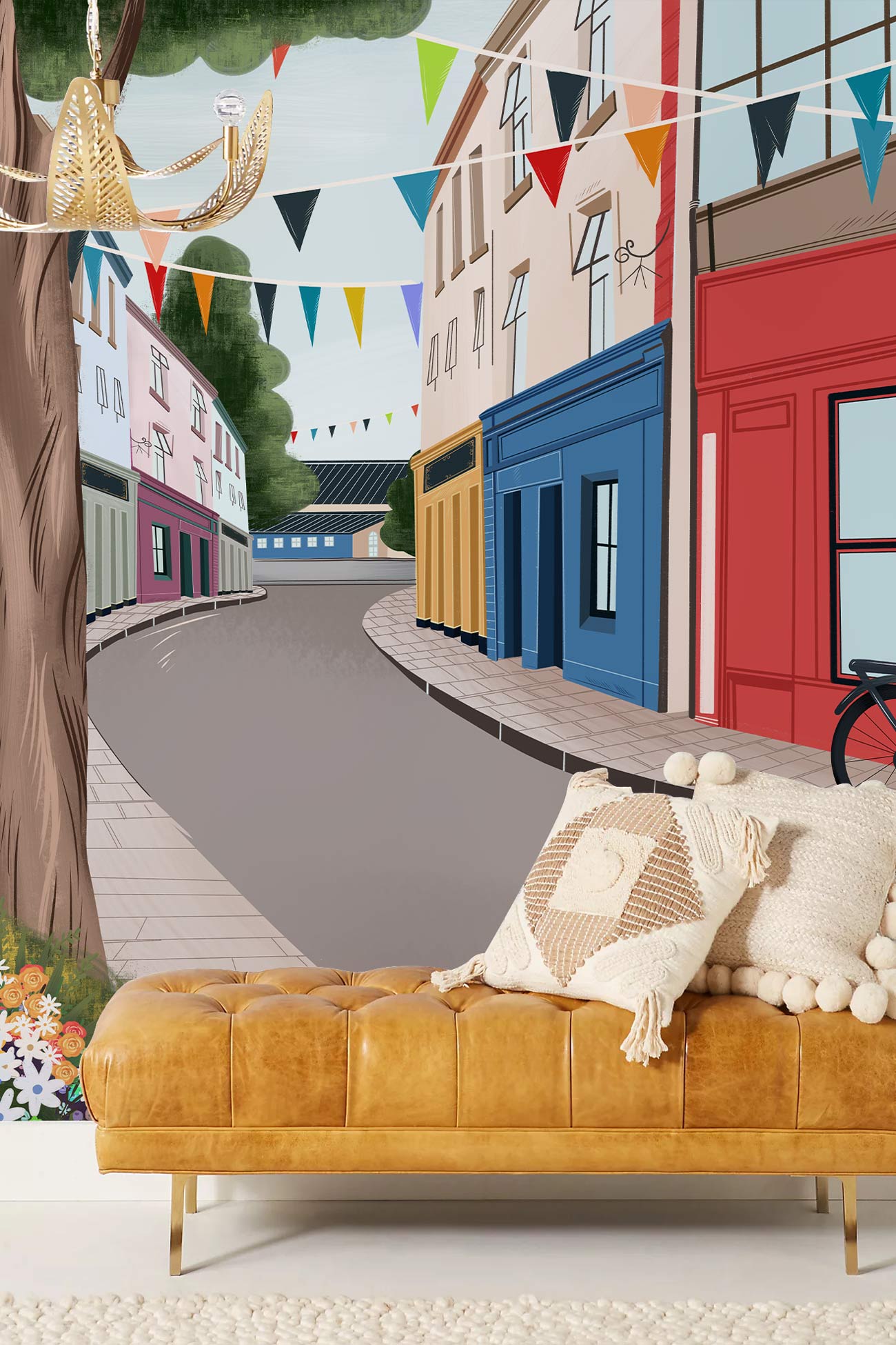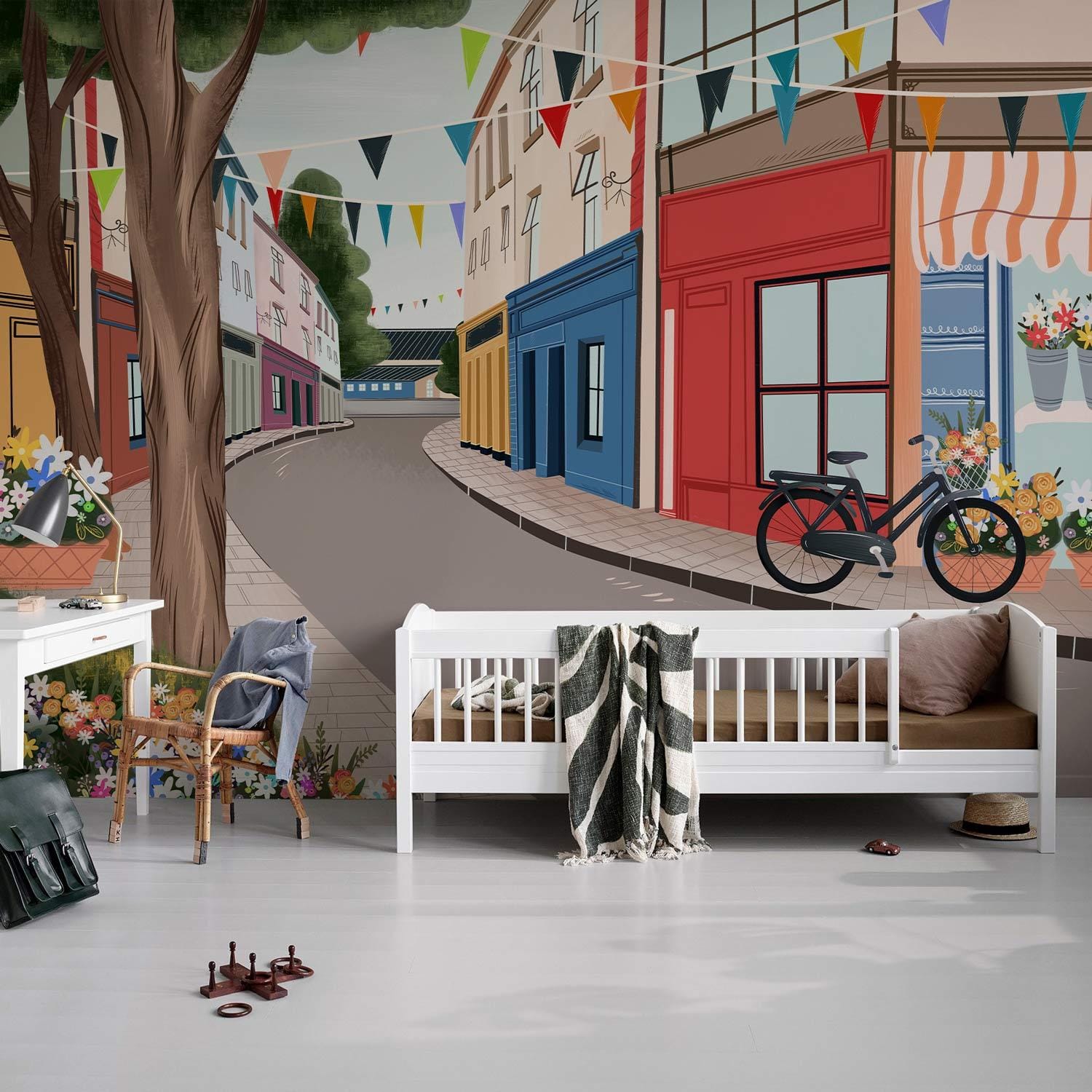 Immerse your space in the charming allure of a tranquil townscape with the Empty Street Wallpaper Mural. This exquisite design captures an idyllic street scene, beautifully blending vibrant storefronts and blooming florals to evoke a sense of peaceful wanderlust. Bunting gently sways in the breeze, adding a festive touch, while the textured details lend depth and authenticity. Perfectly suited for both contemporary and classic interiors, it brings a timeless elegance that invites reflection and warmth.