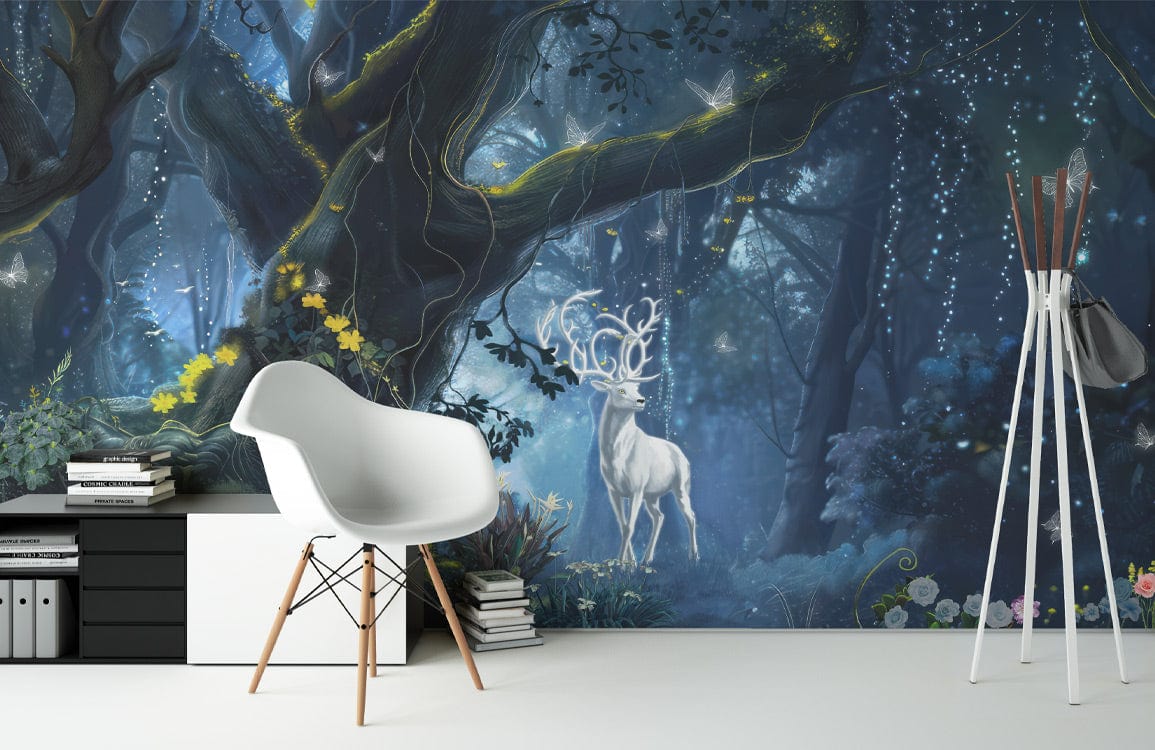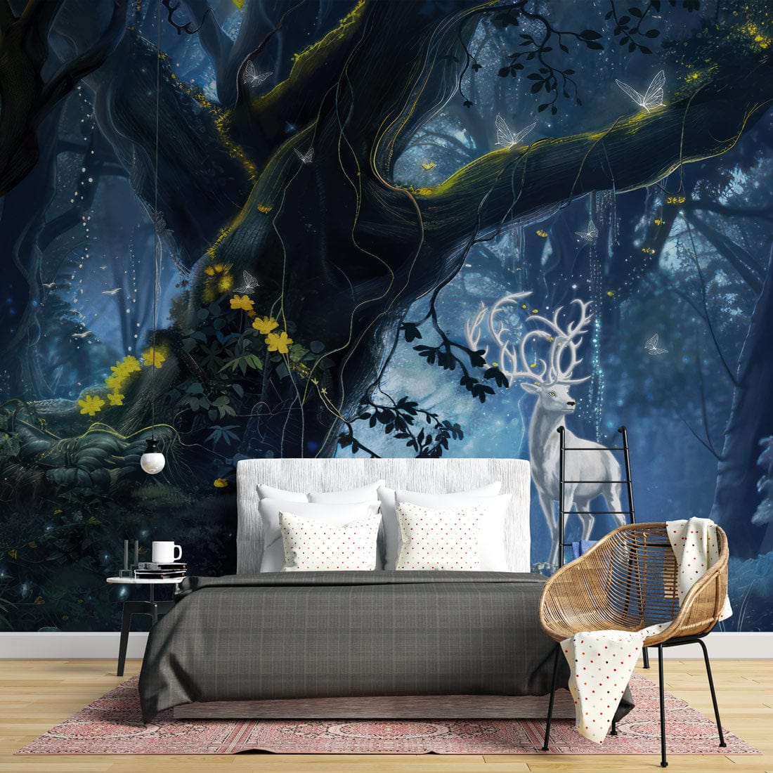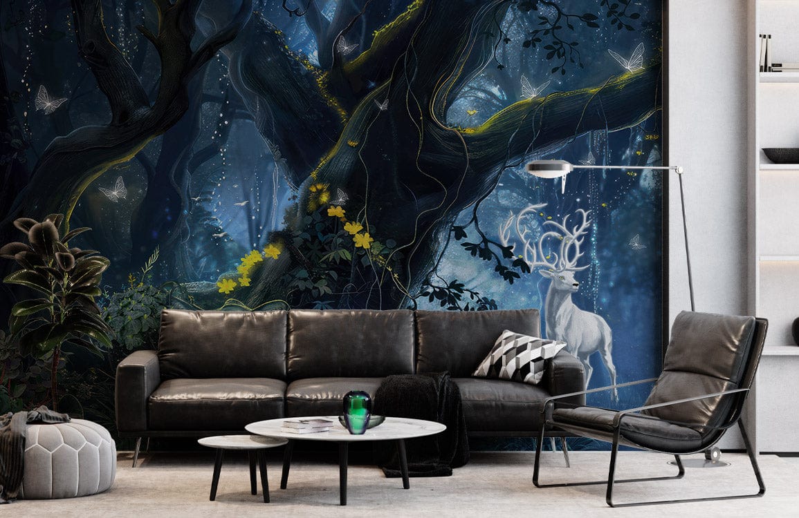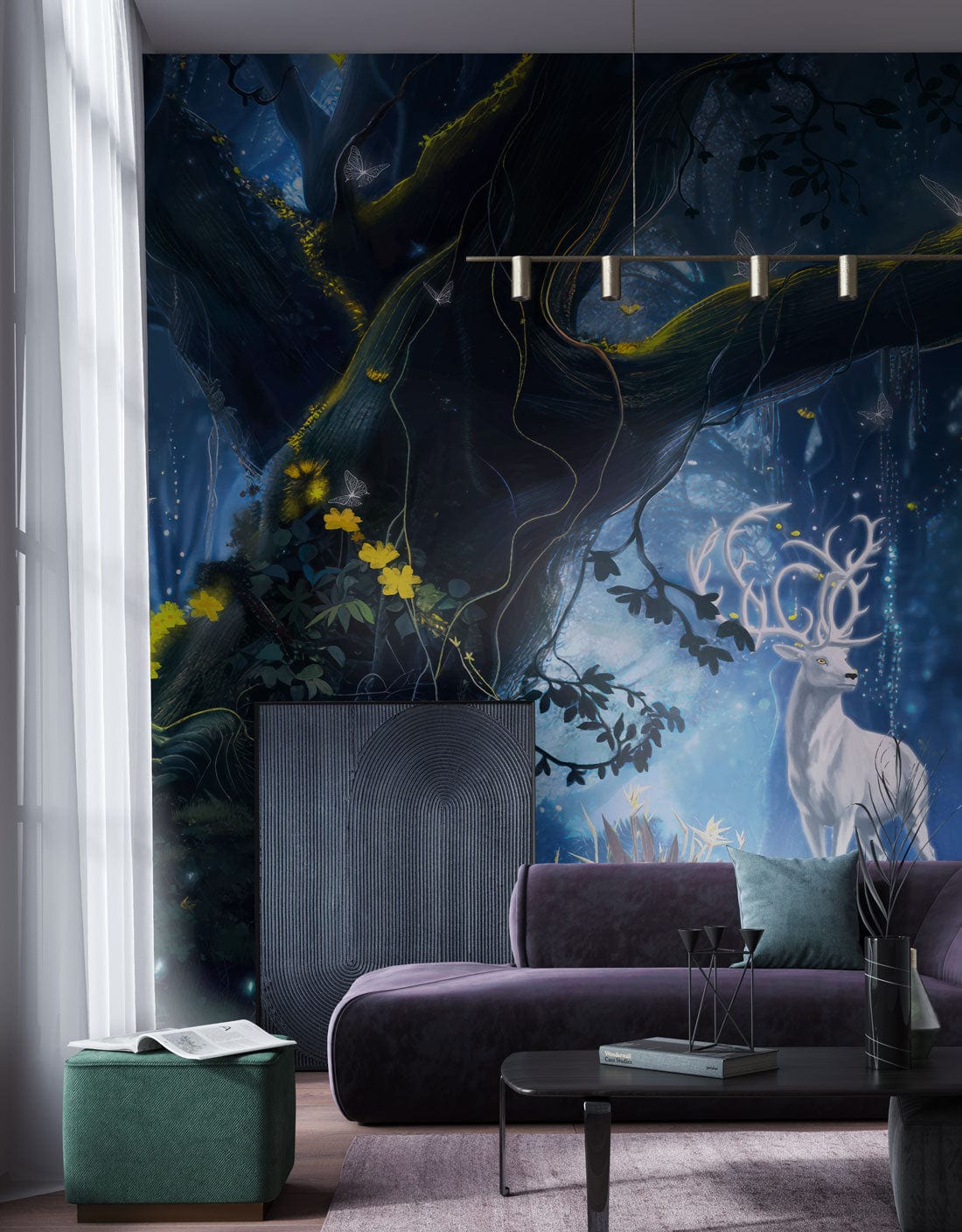 Immerse yourself in the enchanting allure of the Enchanted Forest Haven Mural Wallpaper. This captivating design captures the mystical beauty of a moonlit forest with its ethereal imagery of a majestic stag amidst ancient trees, illuminated by twinkling fairy lights. Its rich textures and intricate detailing create a harmonious blend of fantasy and elegance, making it a timeless piece for any sophisticated interior.