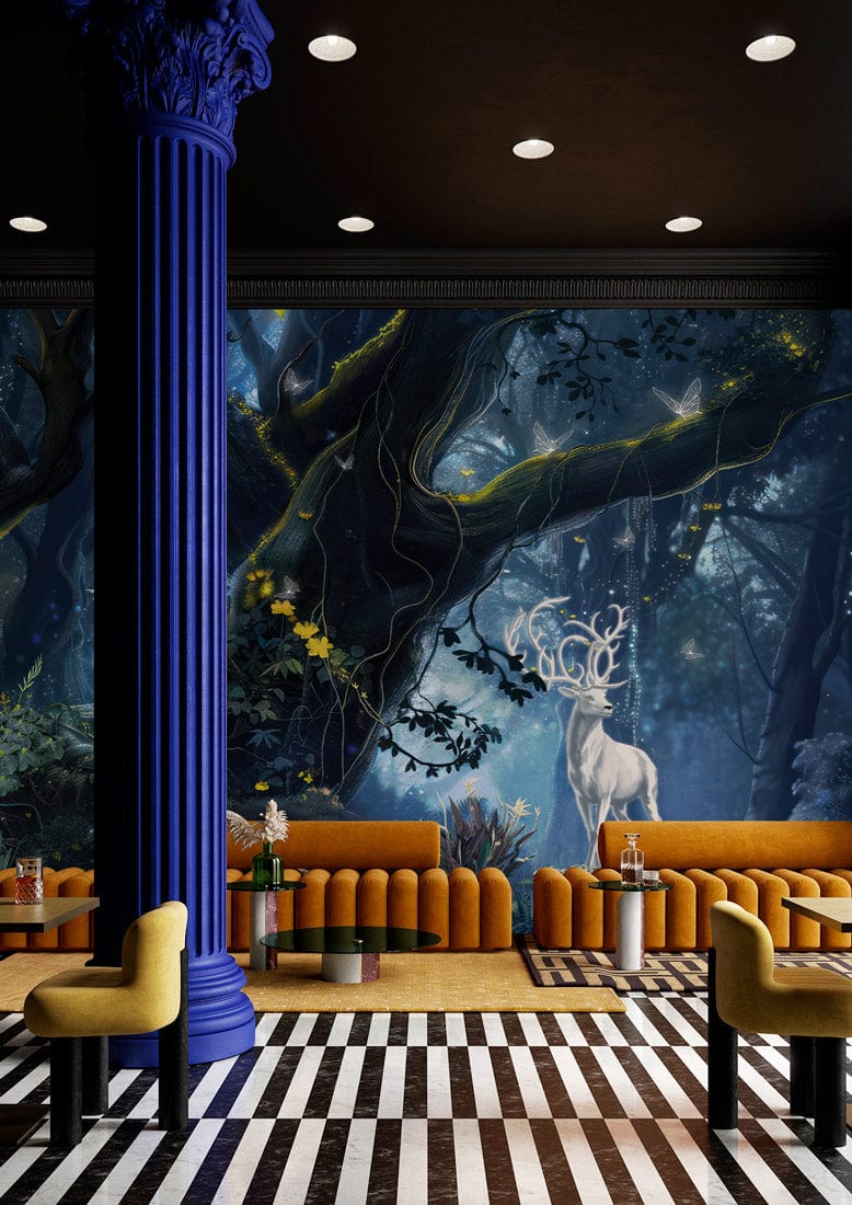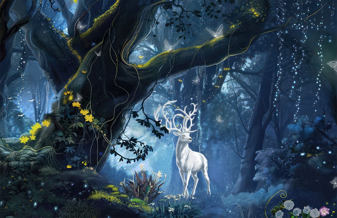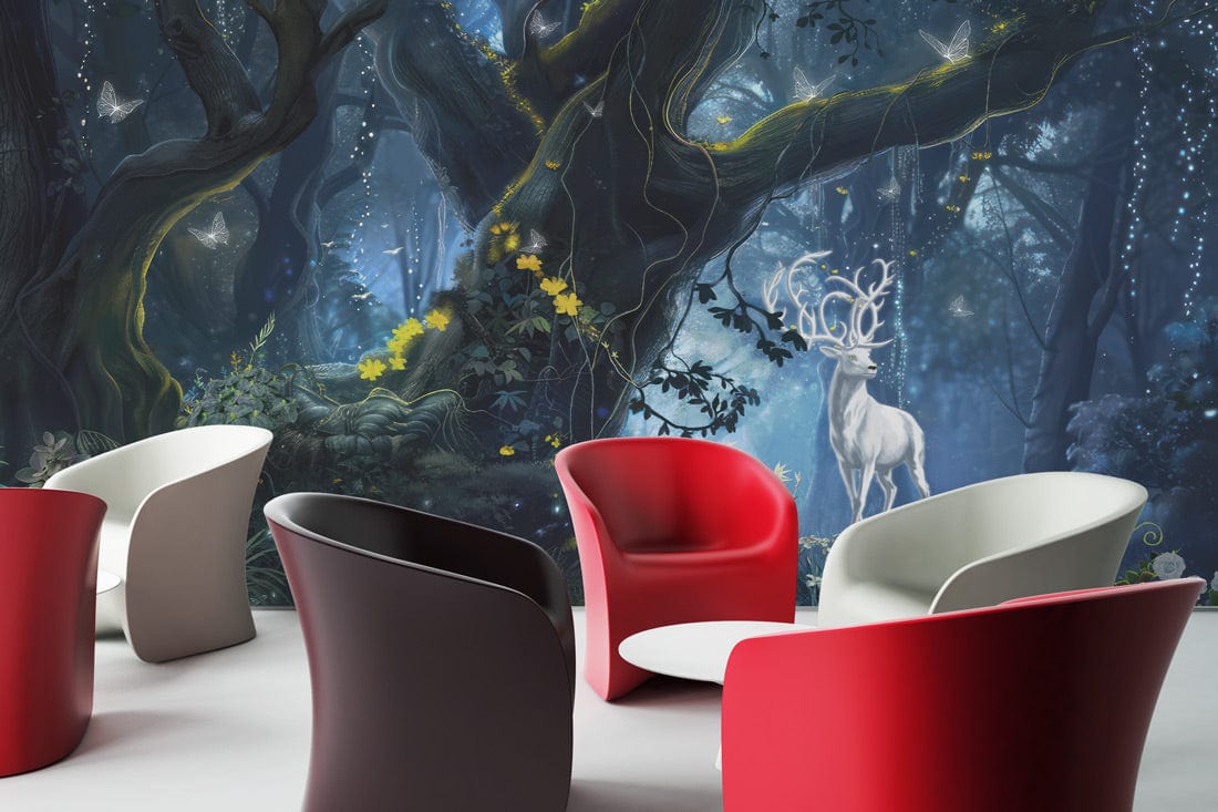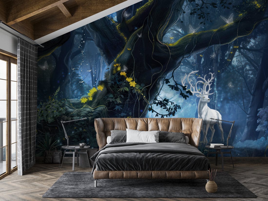 Immerse yourself in the enchanting allure of the Enchanted Forest Haven Mural Wallpaper. This captivating design captures the mystical beauty of a moonlit forest with its ethereal imagery of a majestic stag amidst ancient trees, illuminated by twinkling fairy lights. Its rich textures and intricate detailing create a harmonious blend of fantasy and elegance, making it a timeless piece for any sophisticated interior.