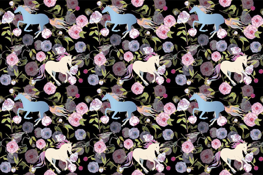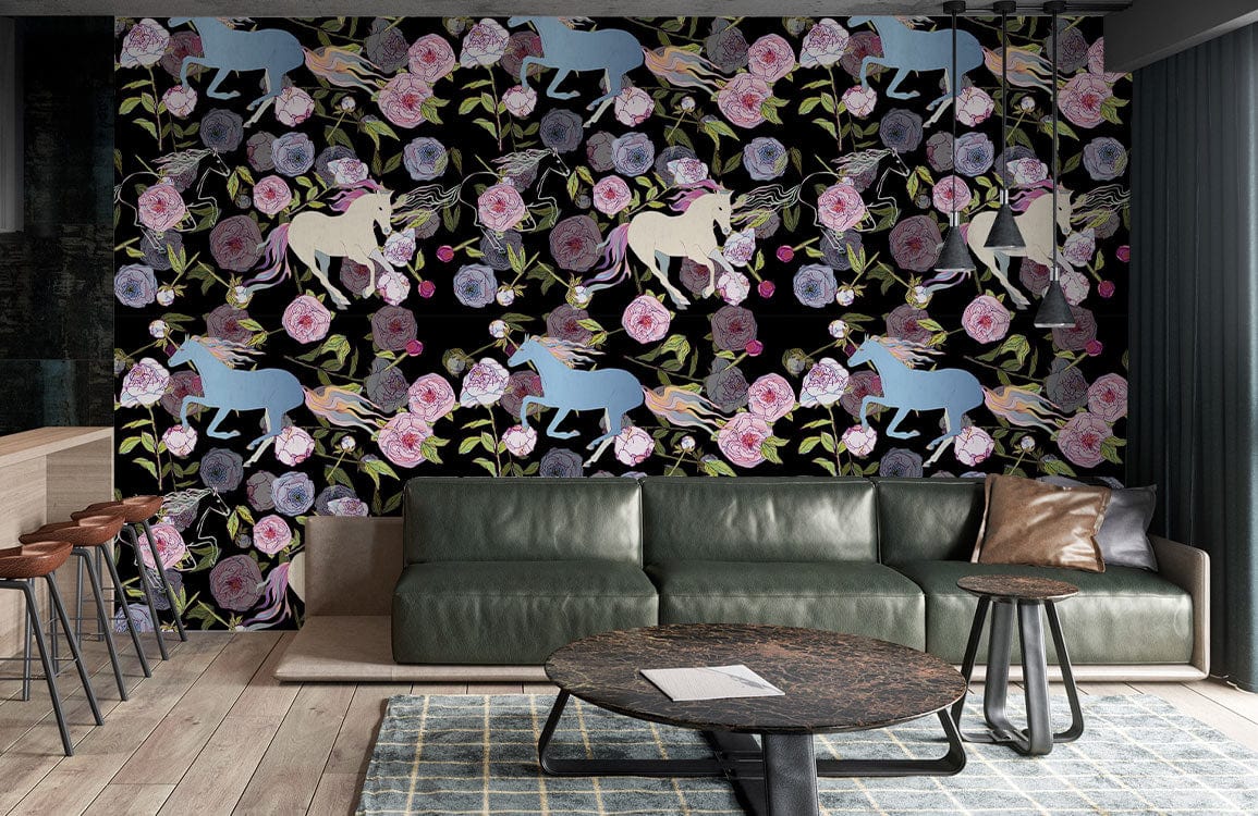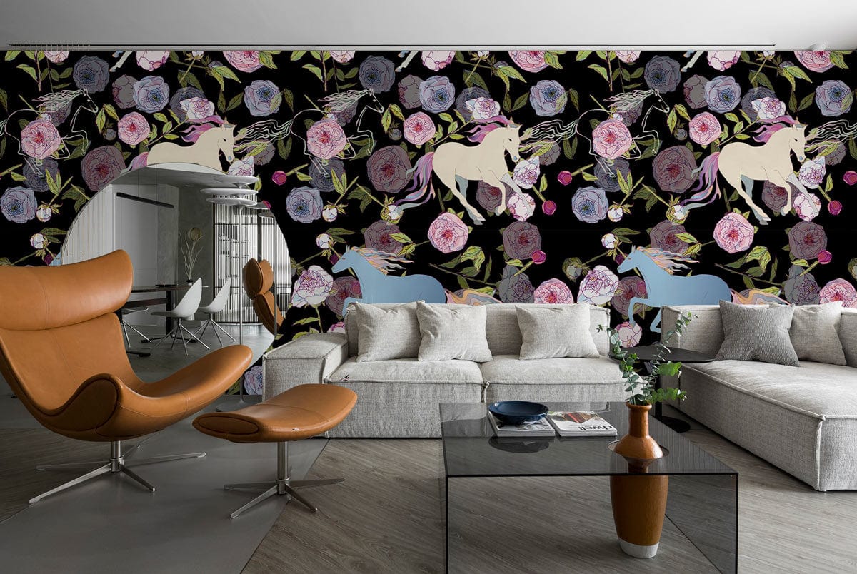 Immerse your space in an exquisite tapestry of ethereal beauty with the Enchanted Garden Mural Wallpaper. Delicate unicorns gracefully prance amidst a lush array of blooming roses and intricate foliage, set against a backdrop that evokes a sense of fantasy and wonder. Each element is meticulously designed to create a serene yet lively ambience, making it a statement piece for any interior.