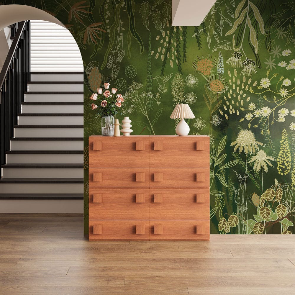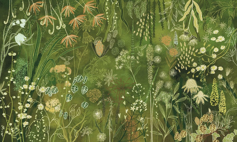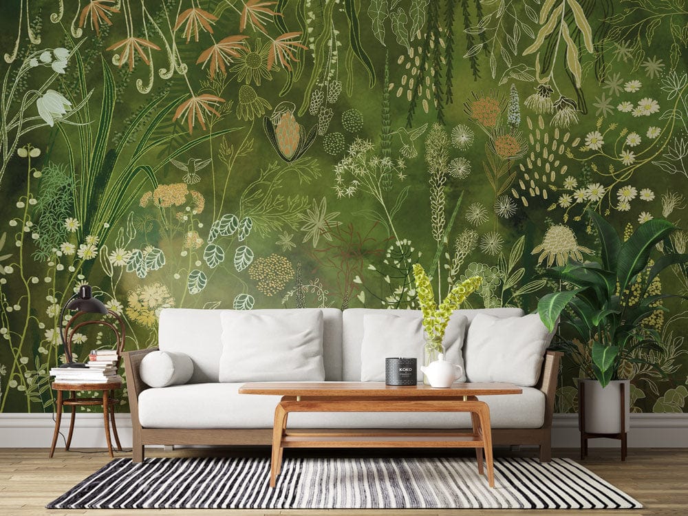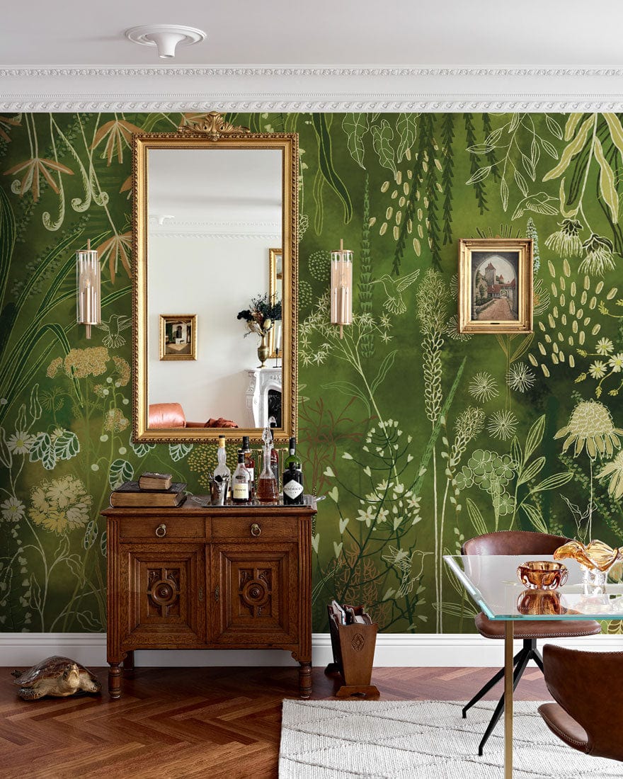 Immerse yourself in the lush elegance of the Enchanted Garden Mural Wallpaper, where a tapestry of intricate botanical motifs flourishes against a rich green backdrop. Each delicate brushstroke captures the vibrant diversity of nature, creating a serene atmosphere that resonates with timeless sophistication. Perfectly suited for creating a statement wall, this mural lends a refined touch to any space with its exquisite detail and natural charisma.