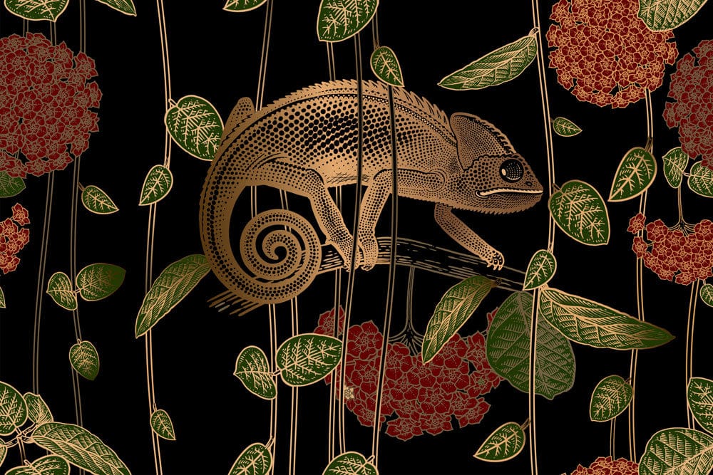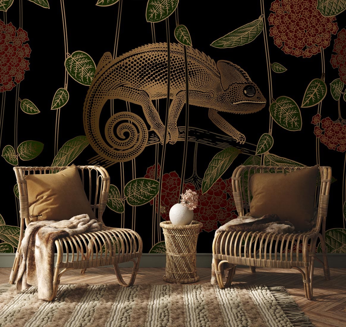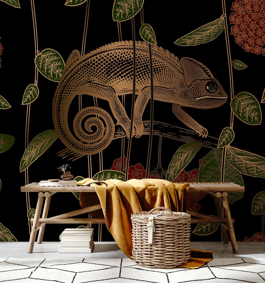The Enchanted Jungle Scene Mural Wallpaper presents a captivating depiction of exotic flora and fauna, artfully detailed to create a lush ambience. The intricate design, featuring a beautifully rendered chameleon amidst deep verdant leaves and vibrant blossoms, evokes a sense of adventure and mystery. Its rich texture and fine detailing impart a sophisticated and timeless aesthetic, seamlessly complementing both classic and contemporary interiors.