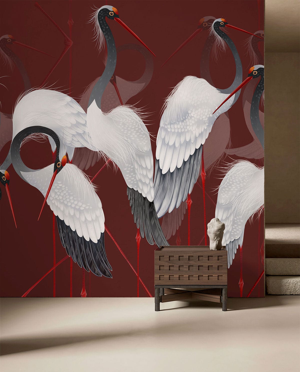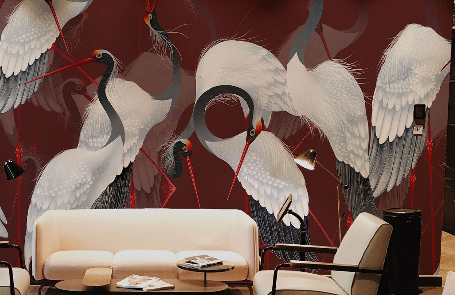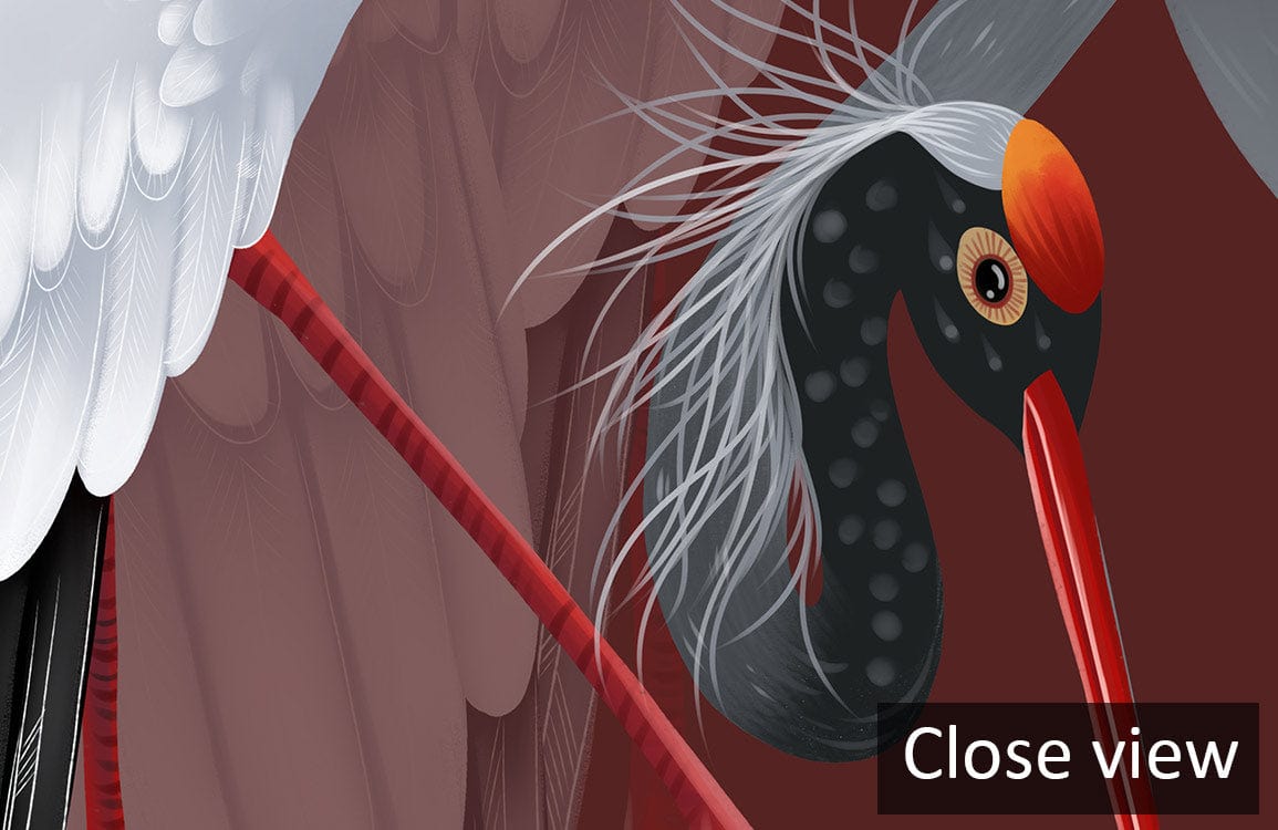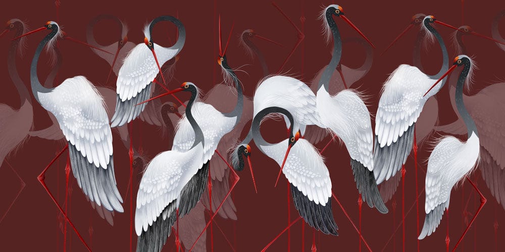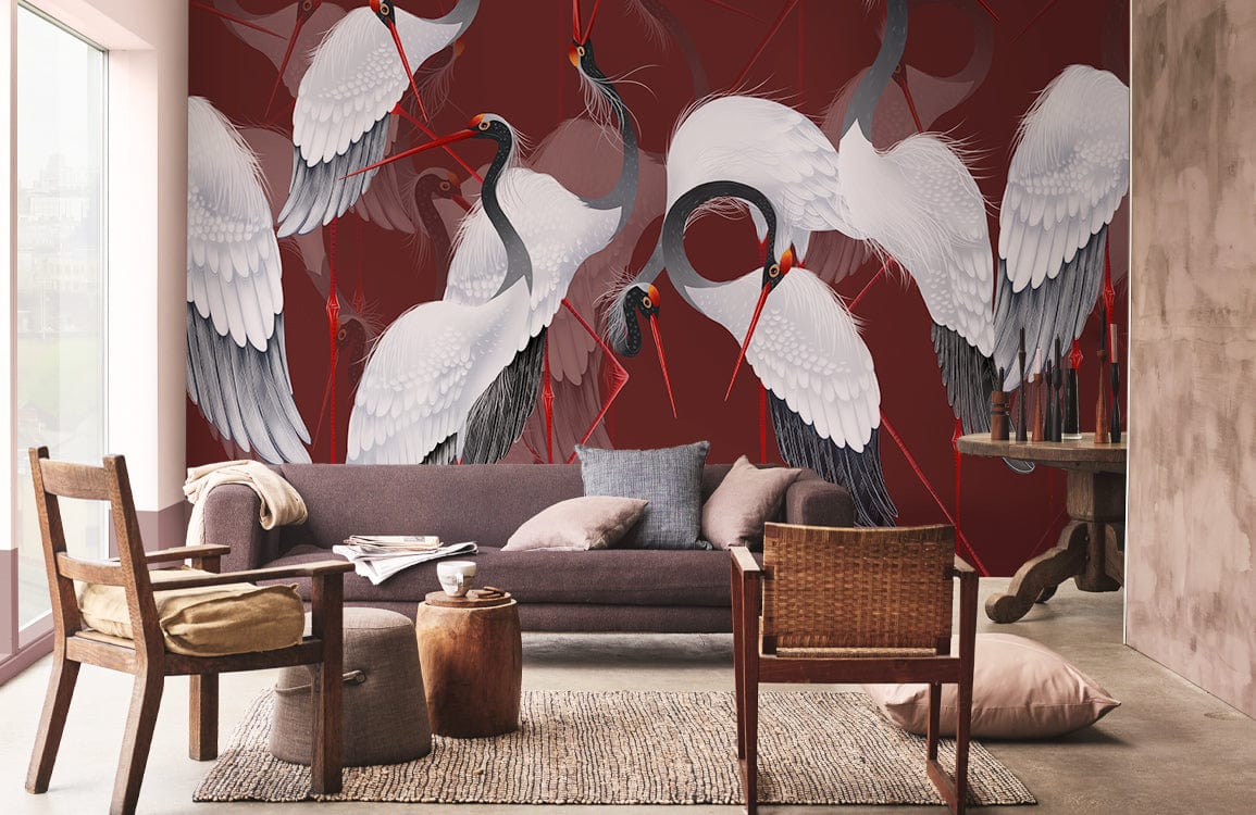 Immerse your space with the exquisite Red-crowned Crane Wallpaper Mural, where graceful cranes elegantly glide against a deep, rich burgundy backdrop. Their white plumage, delicately accentuated with subtle grey shades and striking red accents, offers a serene yet dynamic presence. This artistic mural, with its intricate detailing and graceful movement, adds a timeless sophistication, making it perfect for both classic and contemporary interiors.