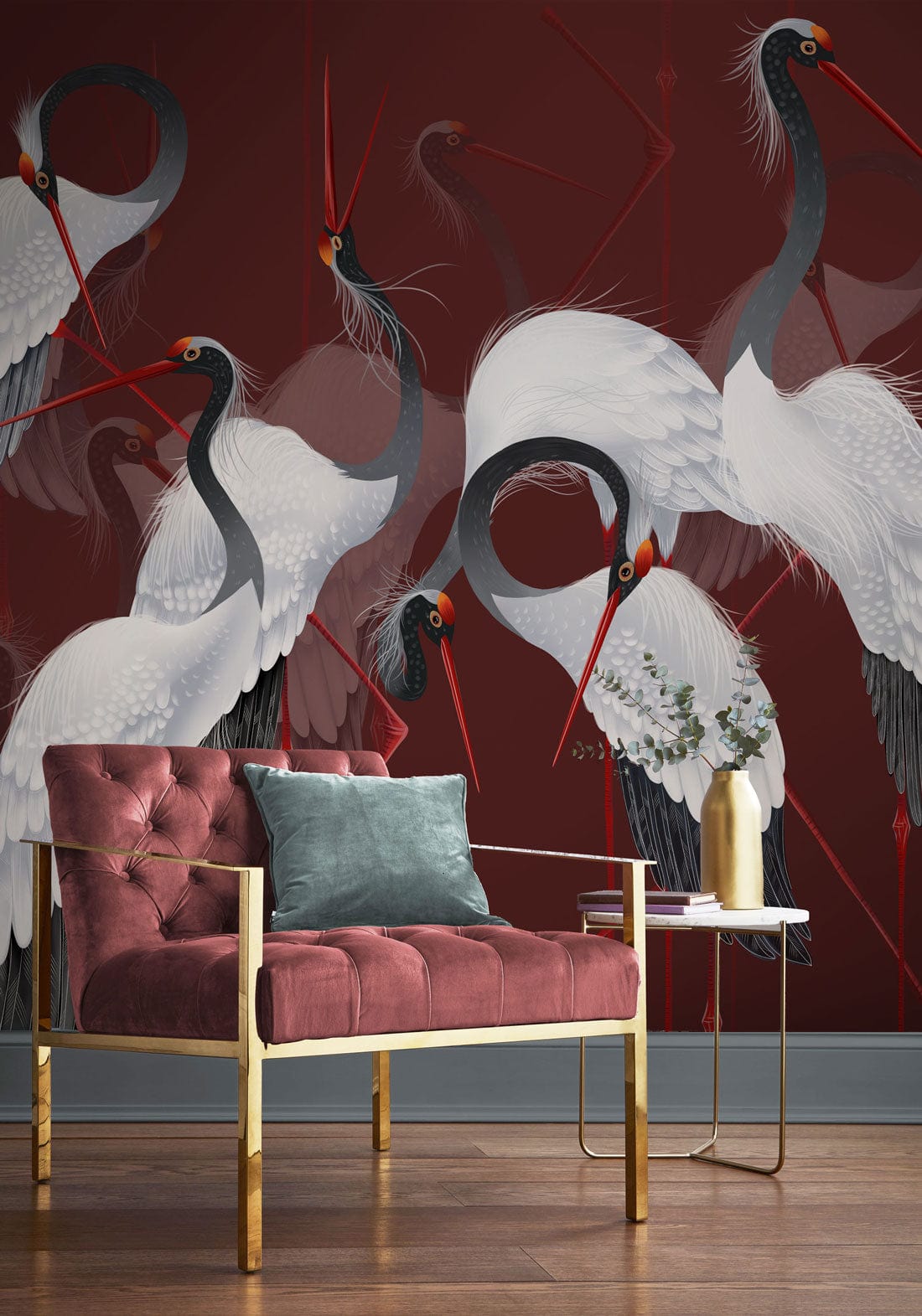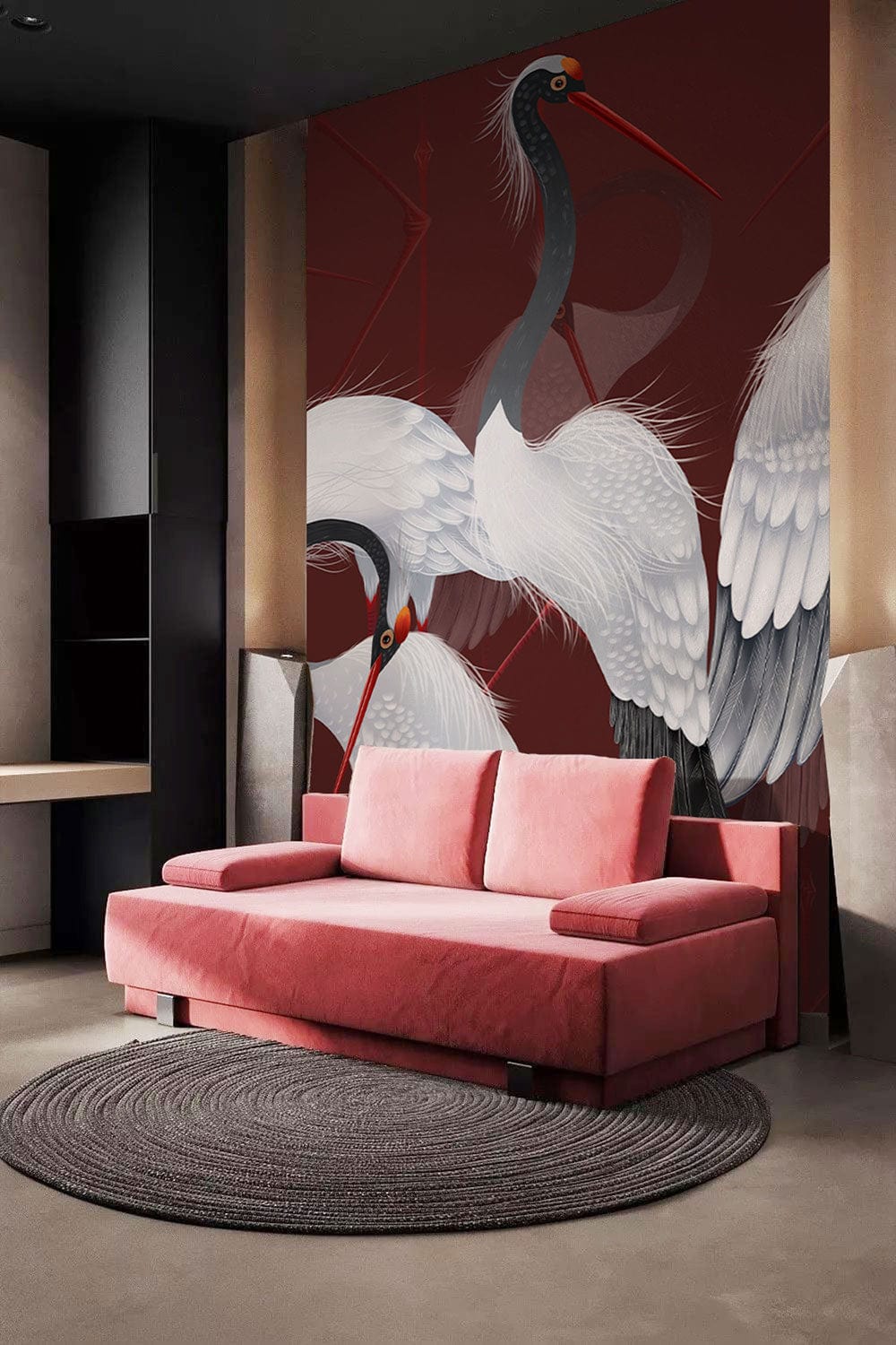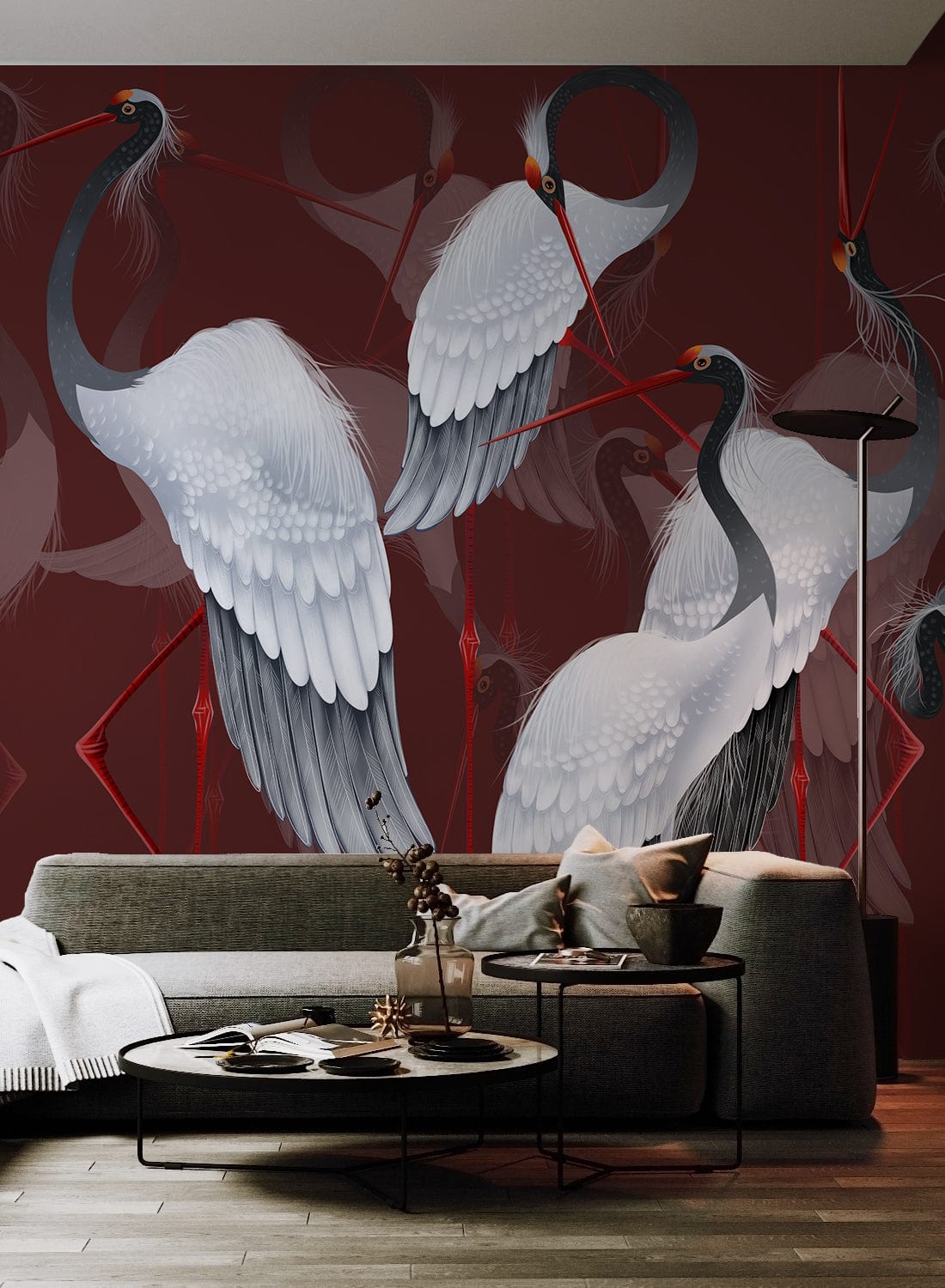 Immerse your space with the exquisite Red-crowned Crane Wallpaper Mural, where graceful cranes elegantly glide against a deep, rich burgundy backdrop. Their white plumage, delicately accentuated with subtle grey shades and striking red accents, offers a serene yet dynamic presence. This artistic mural, with its intricate detailing and graceful movement, adds a timeless sophistication, making it perfect for both classic and contemporary interiors.