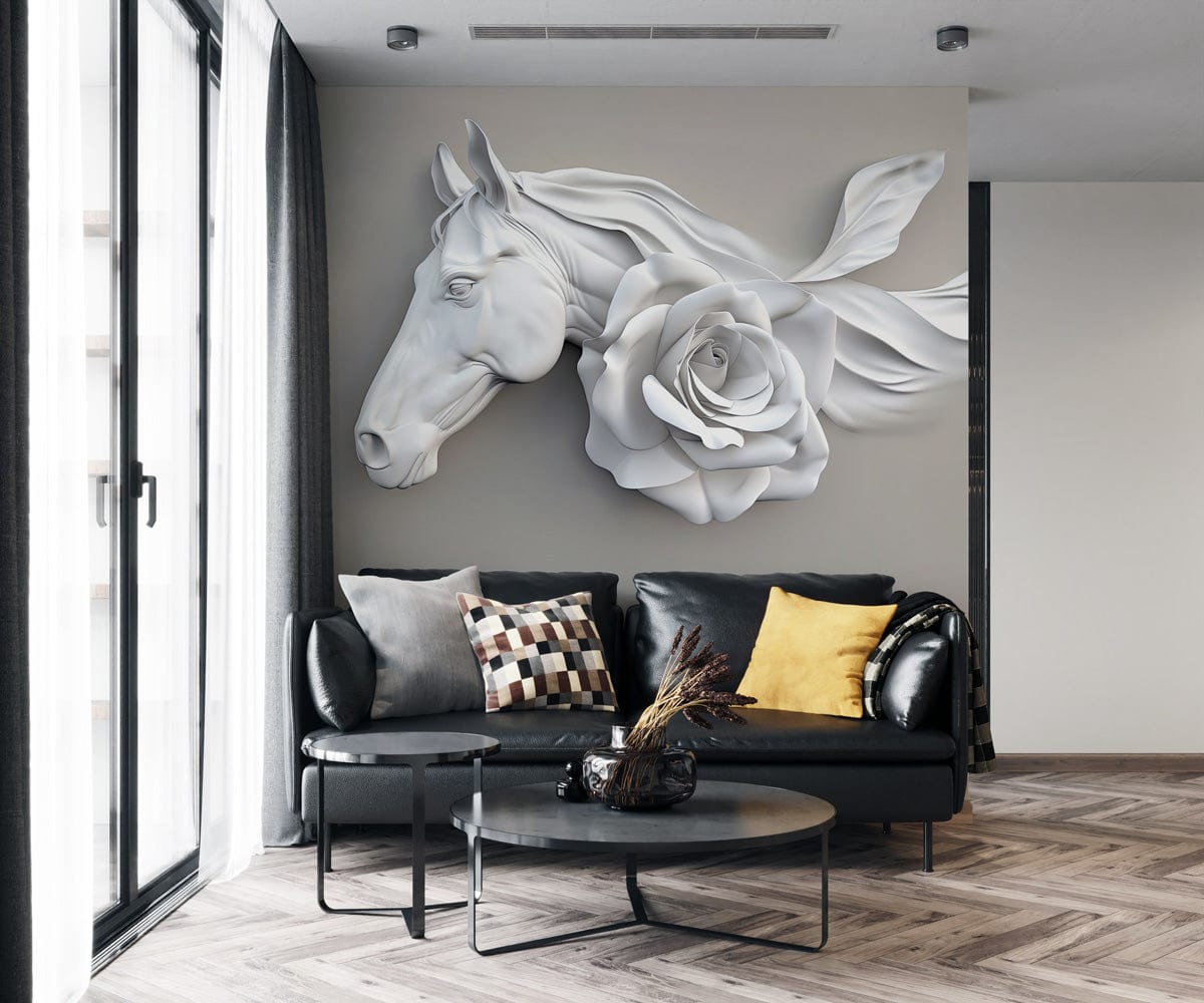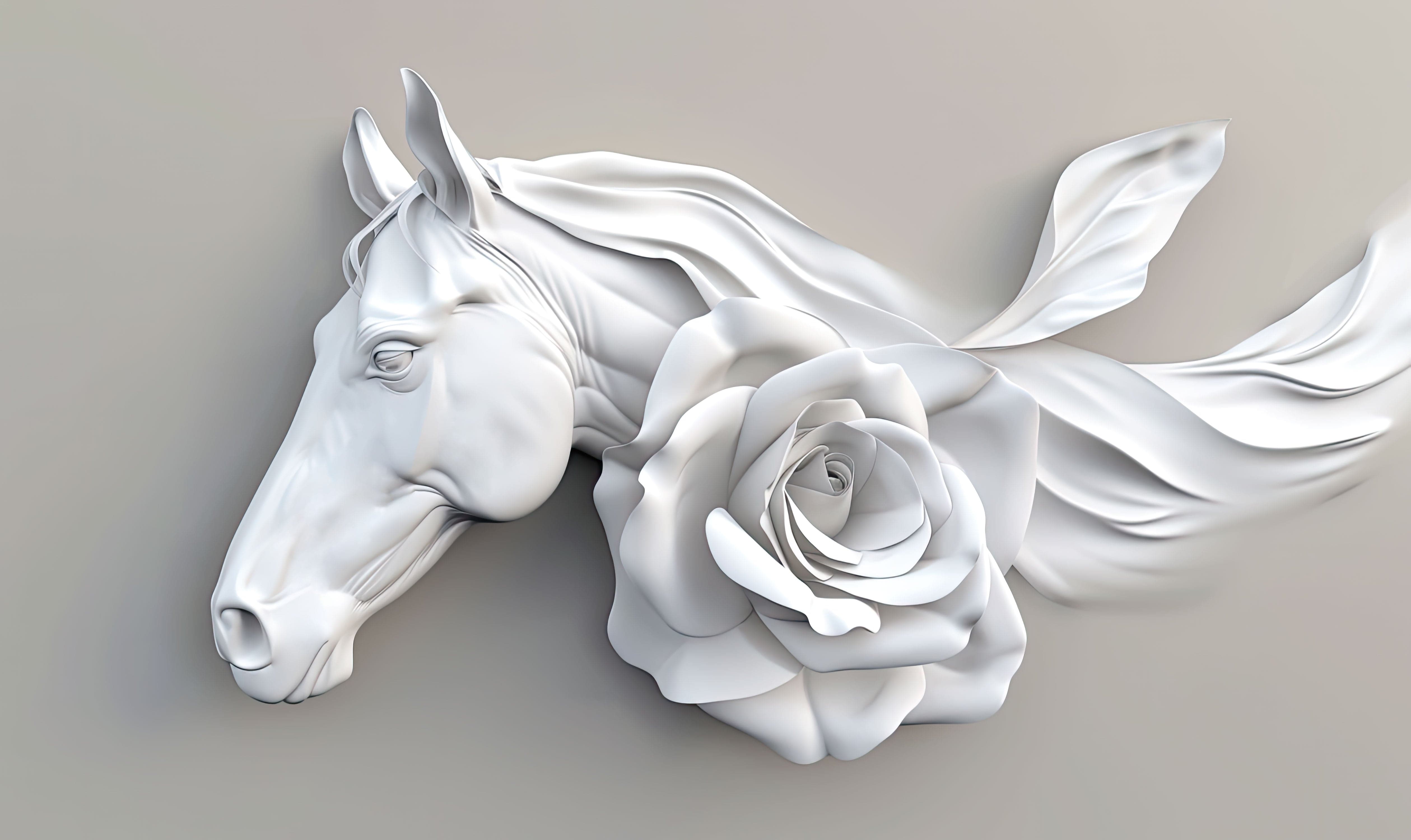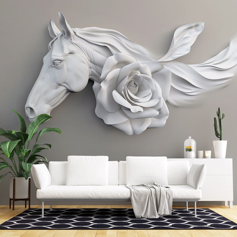 Immerse your space in sophistication with the Equestrian Elegance Unveiled Mural Wallpaper. This stunning design features a graceful horse head seamlessly intertwined with a delicate rose, evoking a sense of classic refinement. The subtle interplay of shadows and textures brings depth and character, creating an artistic focal point perfect for any room. Its timeless allure and serene palette make it a versatile choice, effortlessly complementing a variety of interior styles.